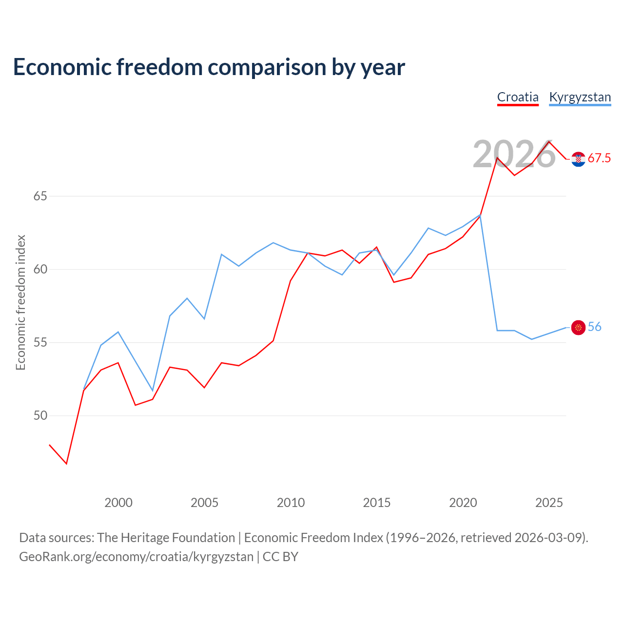 The Economic Freedom Index for Croatia is 67.5, ranking 56/197, compared to 56 for Kyrgyzstan, ranking 126/197. The chart above displays a comparison of annual changes in economic freedom indexes.