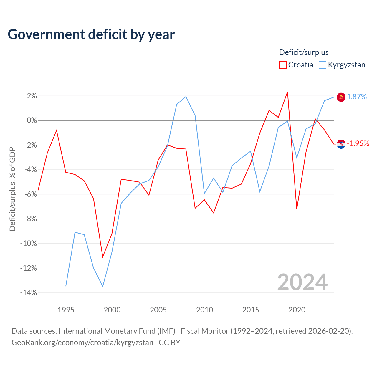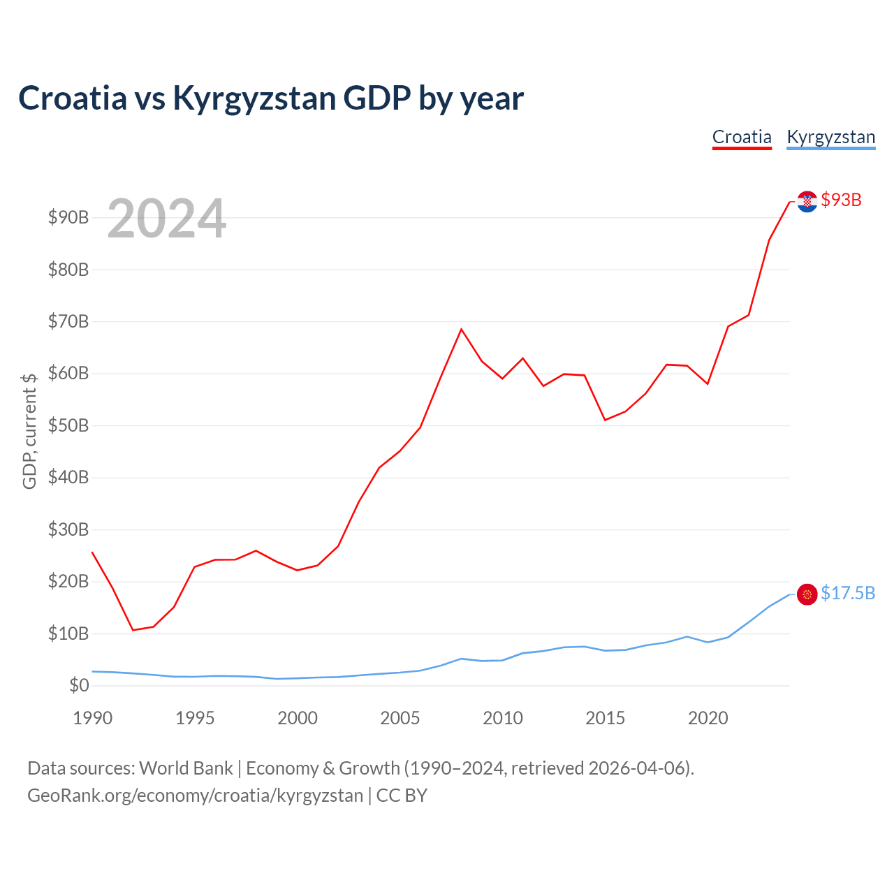 Croatia has a GDP of $93B compared to $17.5B for Kyrgyzstan, ranking 75/197 and 135/197 by economy size, respectively.