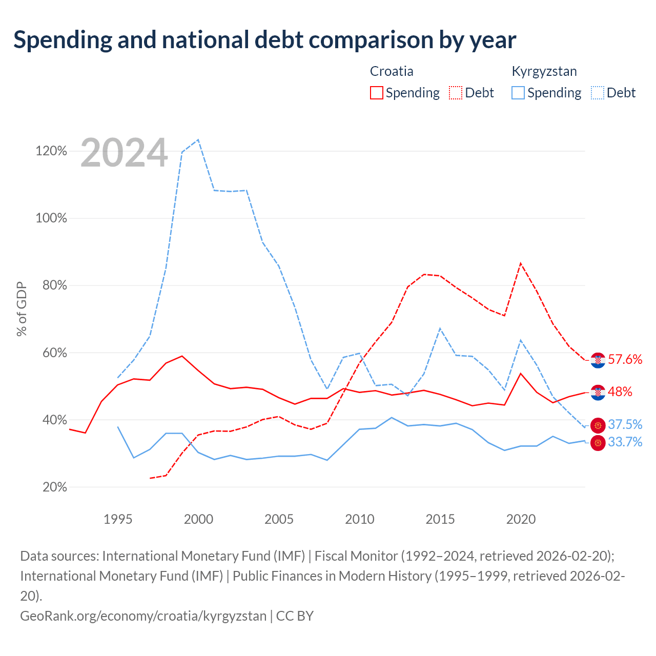 Croatia has $53.5B in government debt (57.6% of GDP), compared to $6.56B (37.5% of GDP) in Kyrgyzstan.