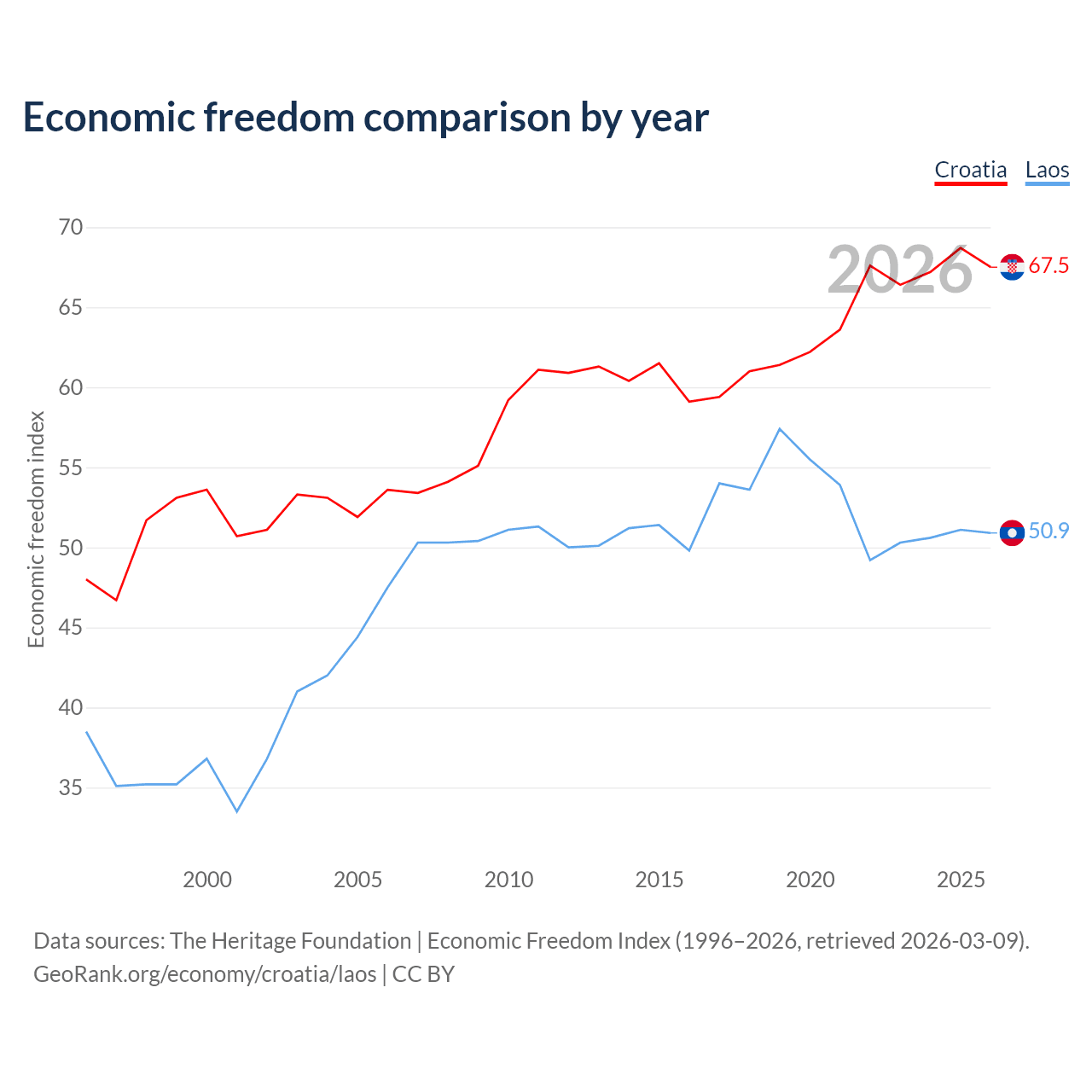The Economic Freedom Index for Croatia is 67.5, ranking 56/197, compared to 50.9 for Laos, ranking 157/197. The chart above displays a comparison of annual changes in economic freedom indexes.