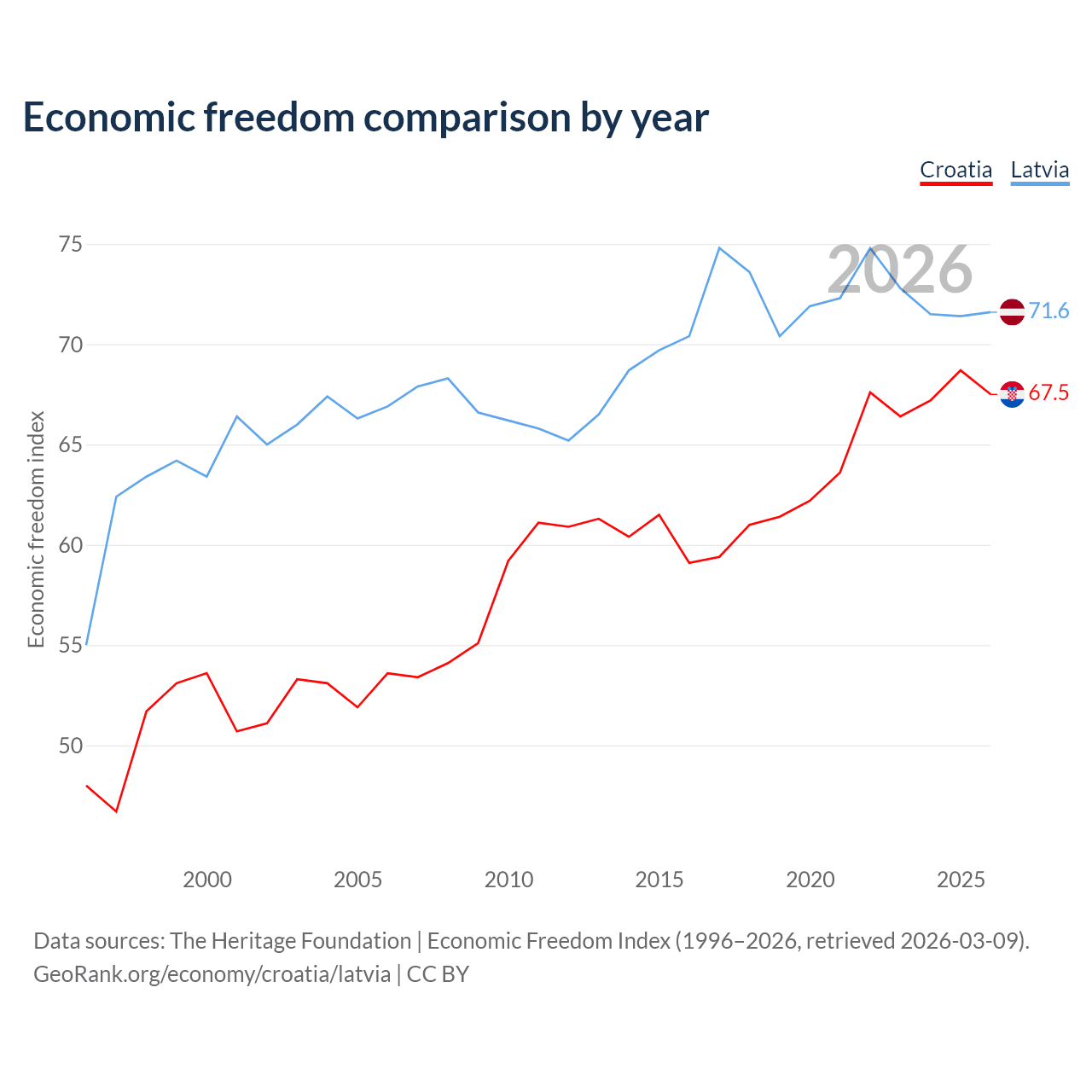 The Economic Freedom Index for Croatia is 67.5, ranking 56/197, compared to 71.6 for Latvia, ranking 31/197. The chart above displays a comparison of annual changes in economic freedom indexes.