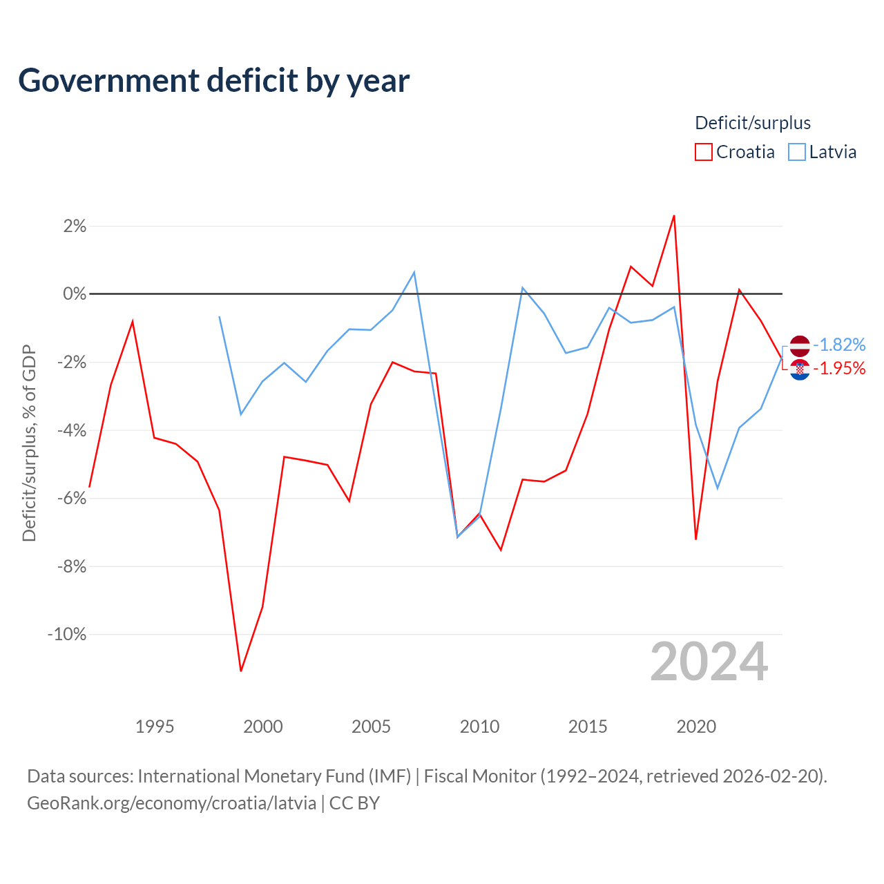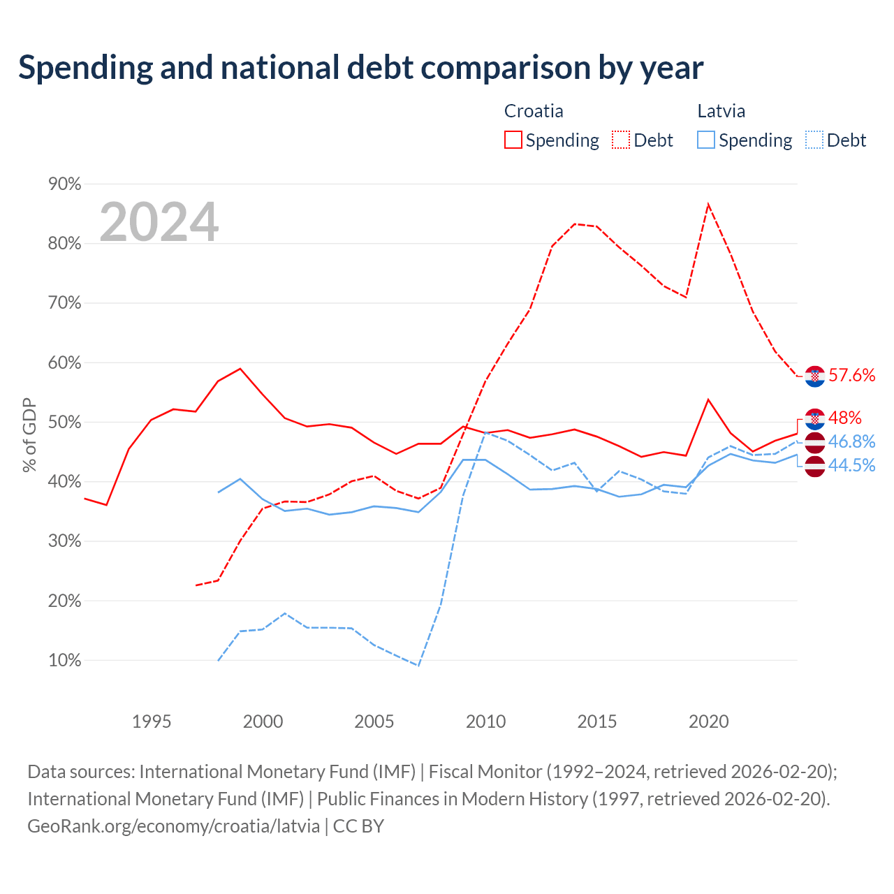 Croatia has $53.5B in government debt (57.6% of GDP), compared to $20.4B (46.8% of GDP) in Latvia.