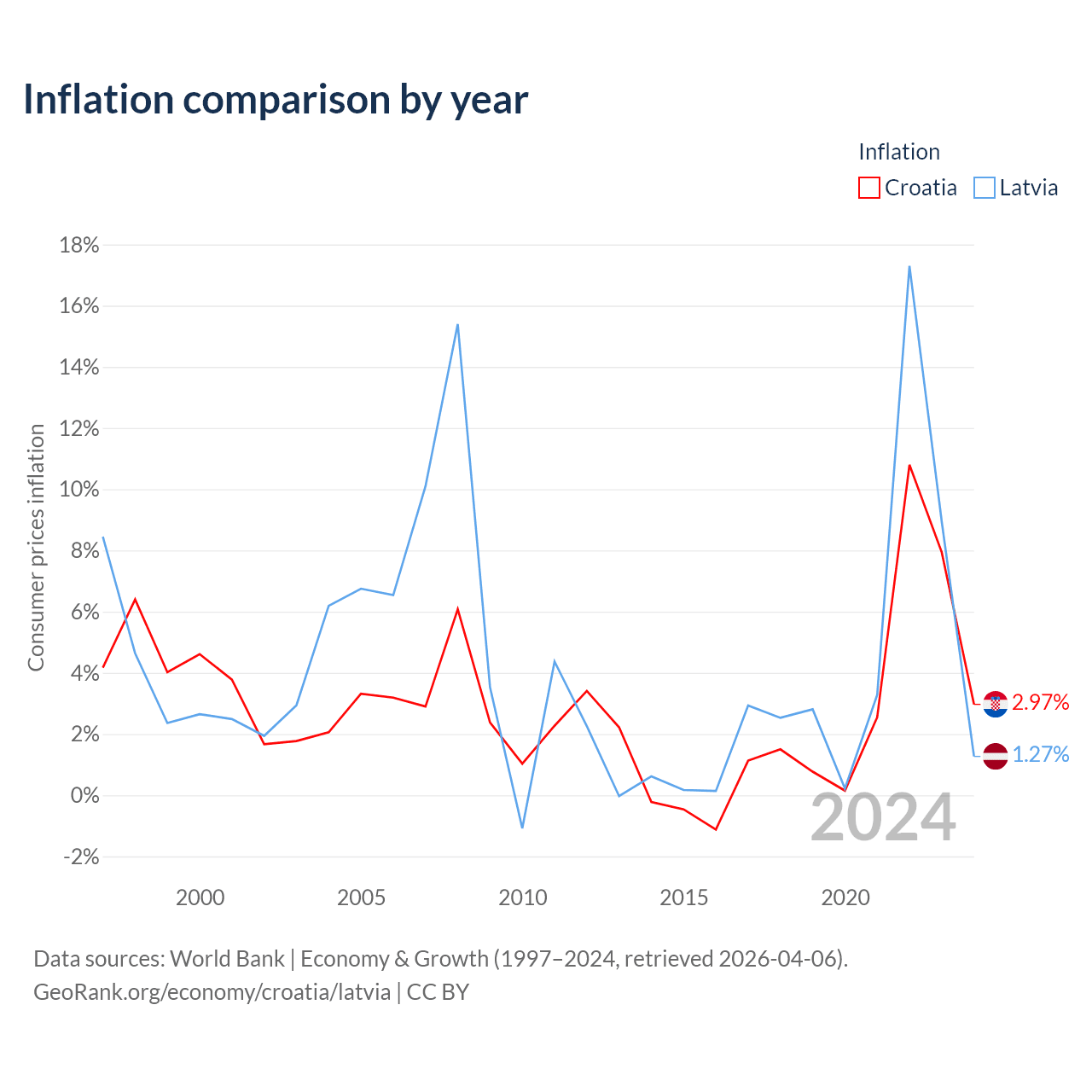 Croatia's GDP per capita is $24,050, ranking 50/197, compared to $23,409 in Latvia, ranking 54/197. Adjusted for purchasing power (GDP per capita PPP), Croatia ranks 46th at $49,551, while Latvia ranks 53rd at $43,394.