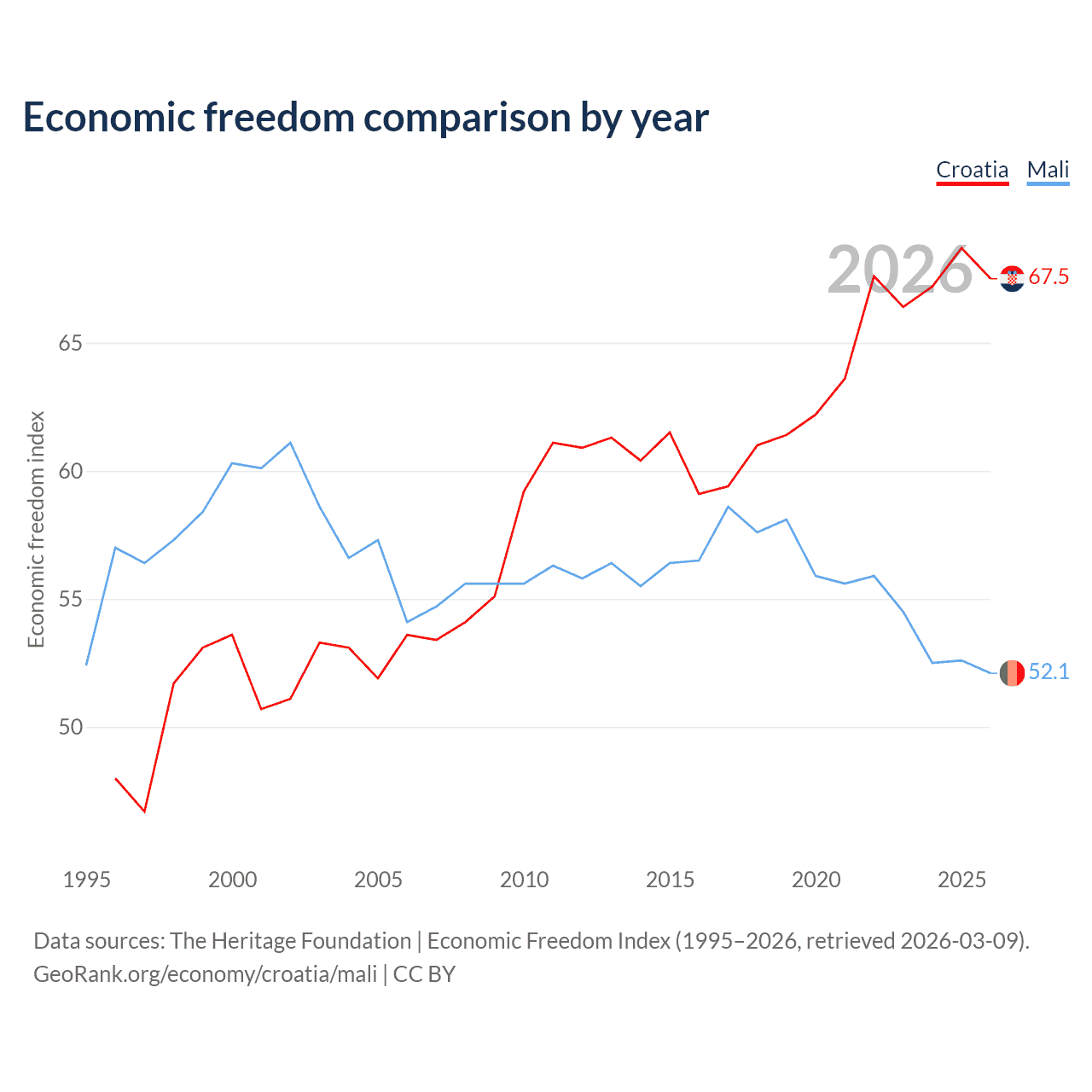 The Economic Freedom Index for Croatia is 67.5, ranking 56/197, compared to 52.1 for Mali, ranking 150/197. The chart above displays a comparison of annual changes in economic freedom indexes.