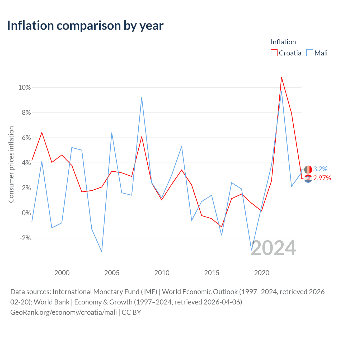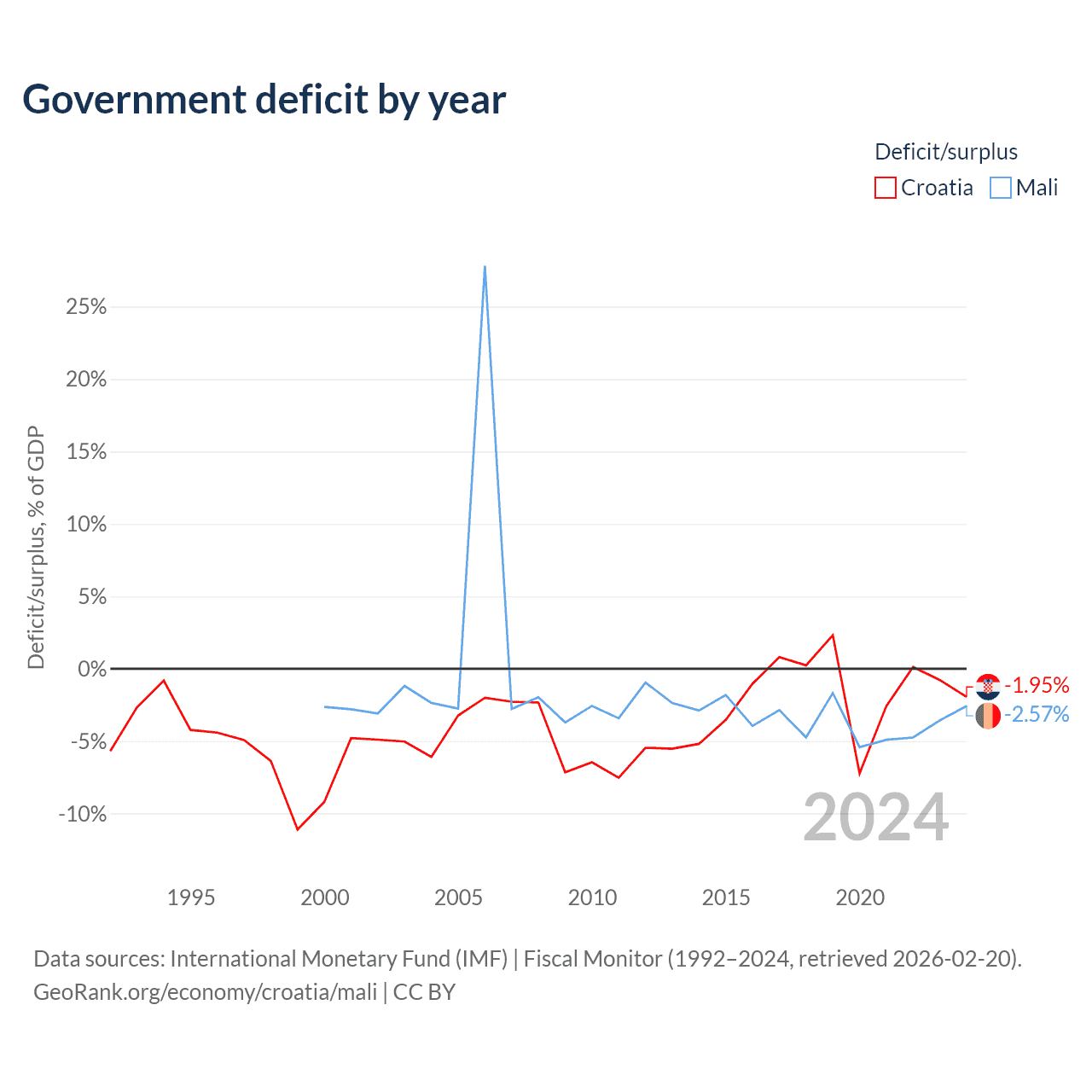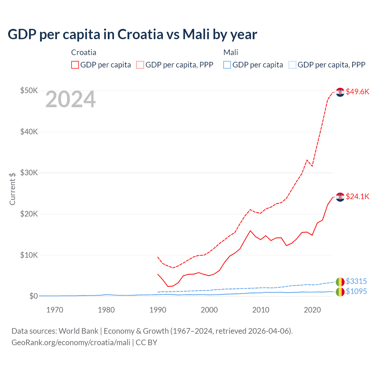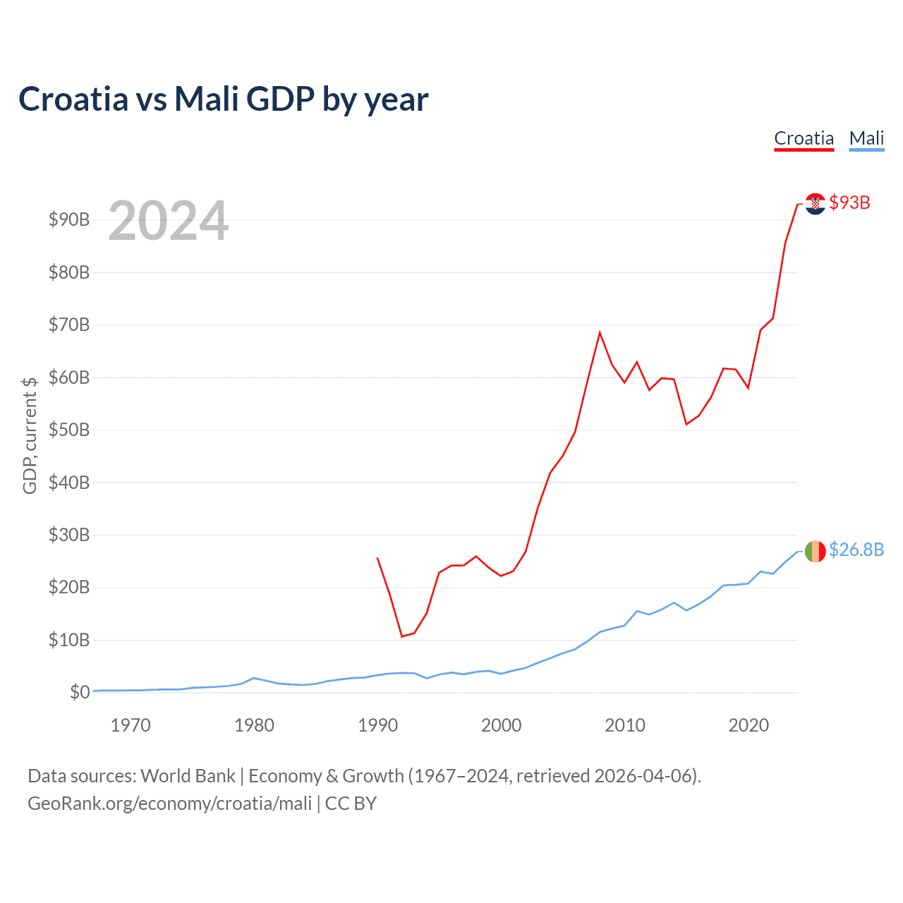 Croatia has a GDP of $93B compared to $26.8B for Mali, ranking 75/197 and 113/197 by economy size, respectively.