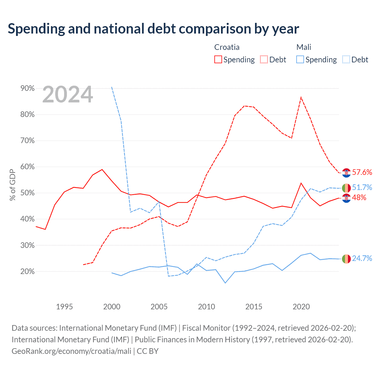 Croatia has $53.5B in government debt (57.6% of GDP), compared to $13.9B (51.7% of GDP) in Mali.