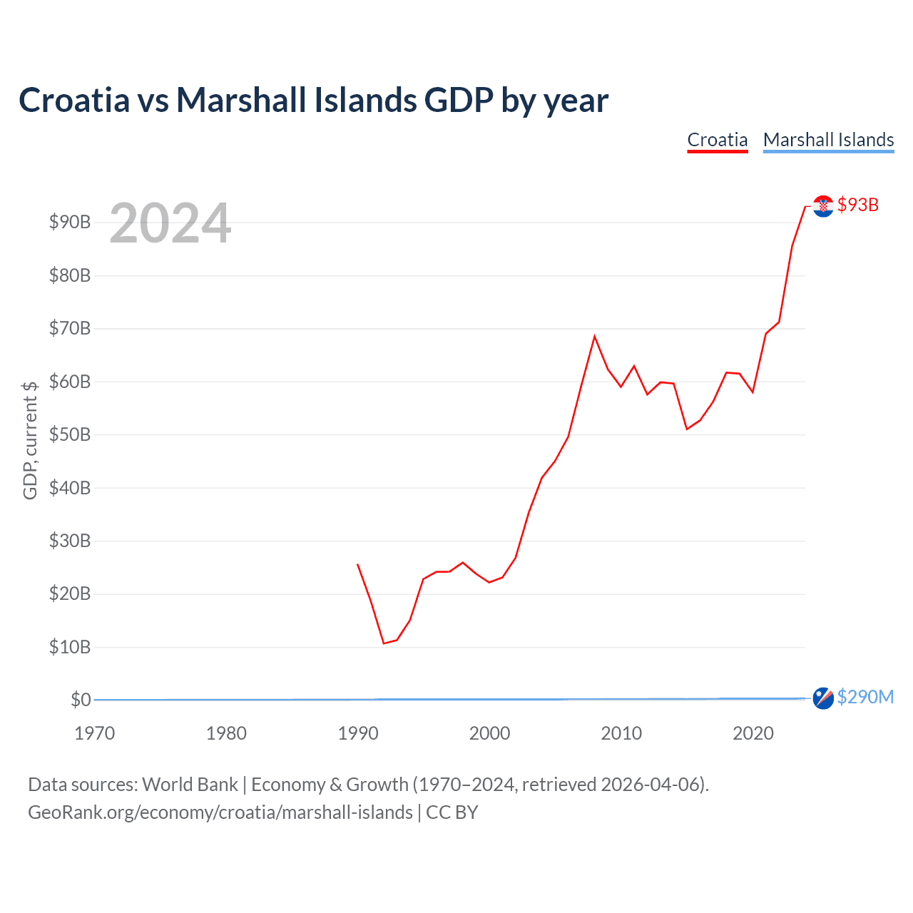 Croatia has a GDP of $93B compared to $290M for the Marshall Islands, ranking 75/197 and 193/197 by economy size, respectively.