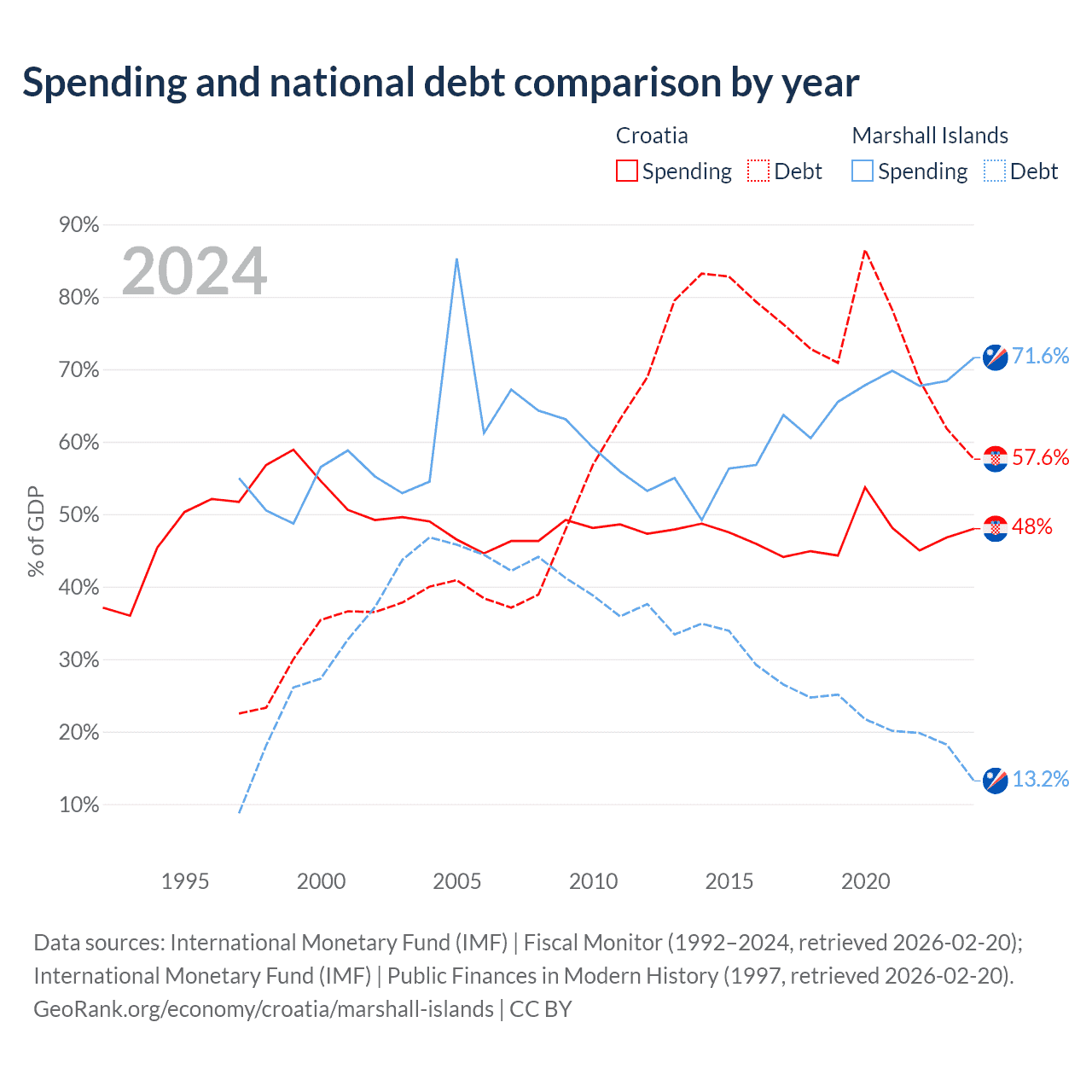 Croatia has $53.5B in government debt (57.6% of GDP), compared to $38.4M (13.2% of GDP) in the Marshall Islands.