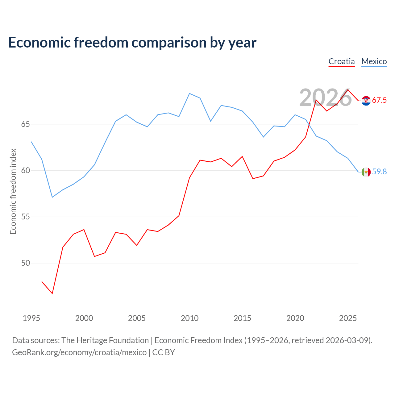 The Economic Freedom Index for Croatia is 67.5, ranking 56/197, compared to 59.8 for Mexico, ranking 102/197. The chart above displays a comparison of annual changes in economic freedom indexes.