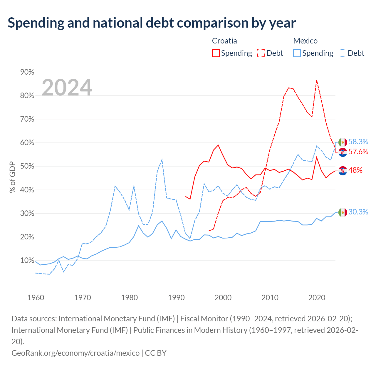 Croatia has $53.5B in government debt (57.6% of GDP), compared to $1.08T (58.3% of GDP) in Mexico.