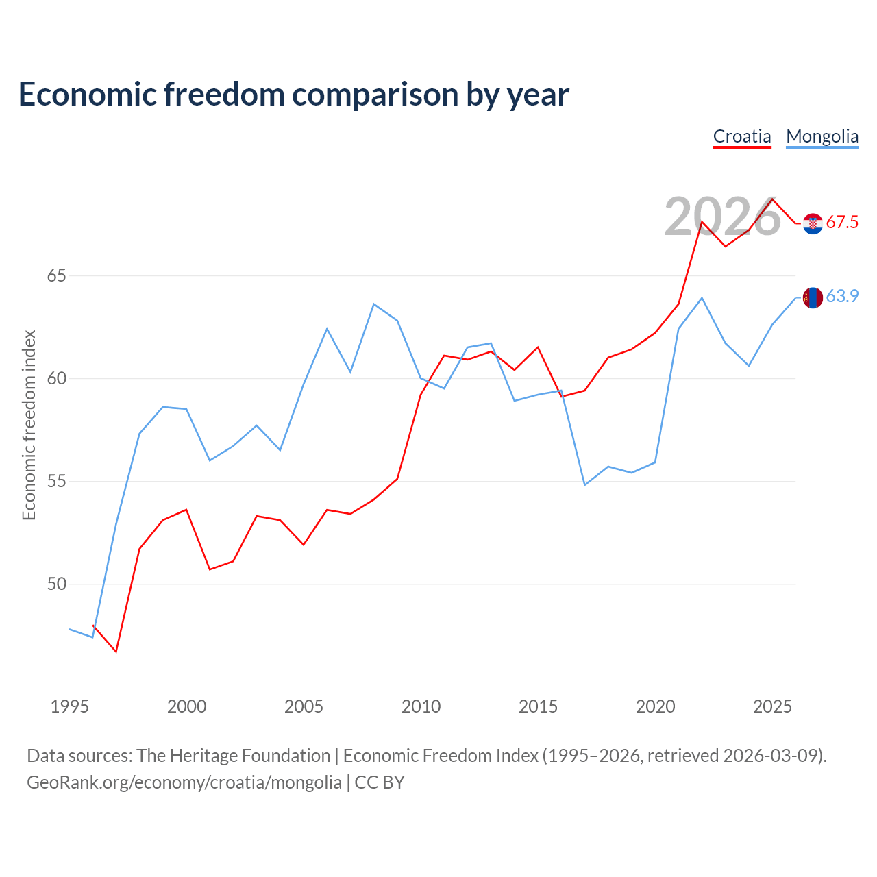 The Economic Freedom Index for Croatia is 67.5, ranking 56/197, compared to 63.9 for Mongolia, ranking 76/197. The chart above displays a comparison of annual changes in economic freedom indexes.