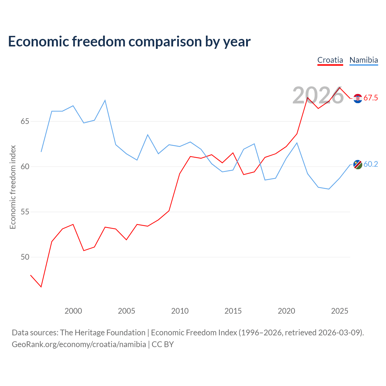 The Economic Freedom Index for Croatia is 67.5, ranking 56/197, compared to 60.2 for Namibia, ranking 95/197. The chart above displays a comparison of annual changes in economic freedom indexes.