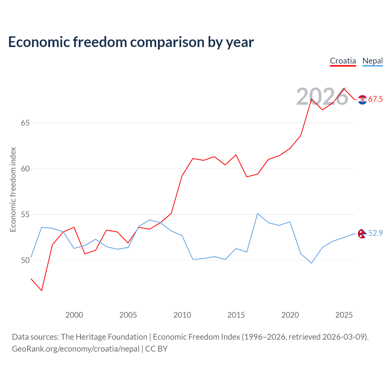 The Economic Freedom Index for Croatia is 67.5, ranking 56/197, compared to 52.9 for Nepal, ranking 144/197. The chart above displays a comparison of annual changes in economic freedom indexes.