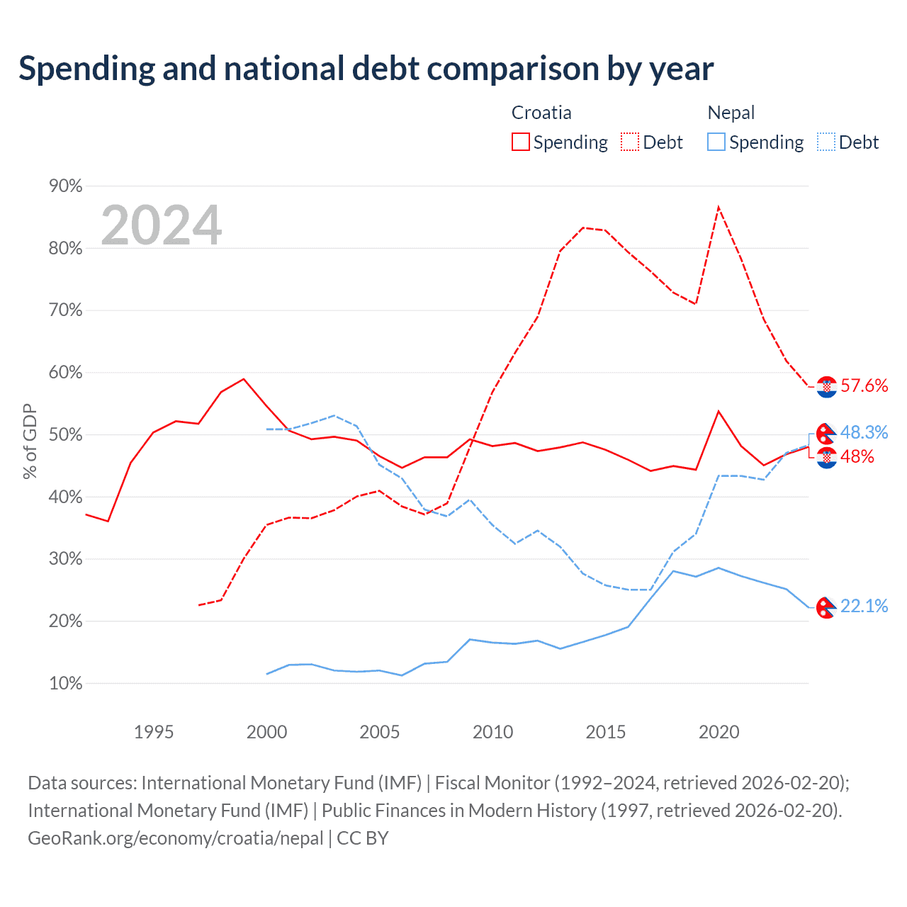 Croatia has $53.5B in government debt (57.6% of GDP), compared to $20.7B (48.3% of GDP) in Nepal.