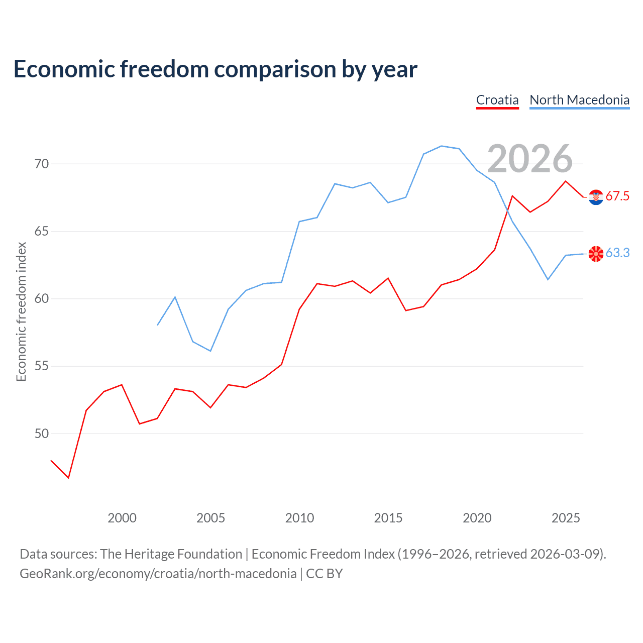 The Economic Freedom Index for Croatia is 67.5, ranking 56/197, compared to 63.3 for North Macedonia, ranking 81/197. The chart above displays a comparison of annual changes in economic freedom indexes.