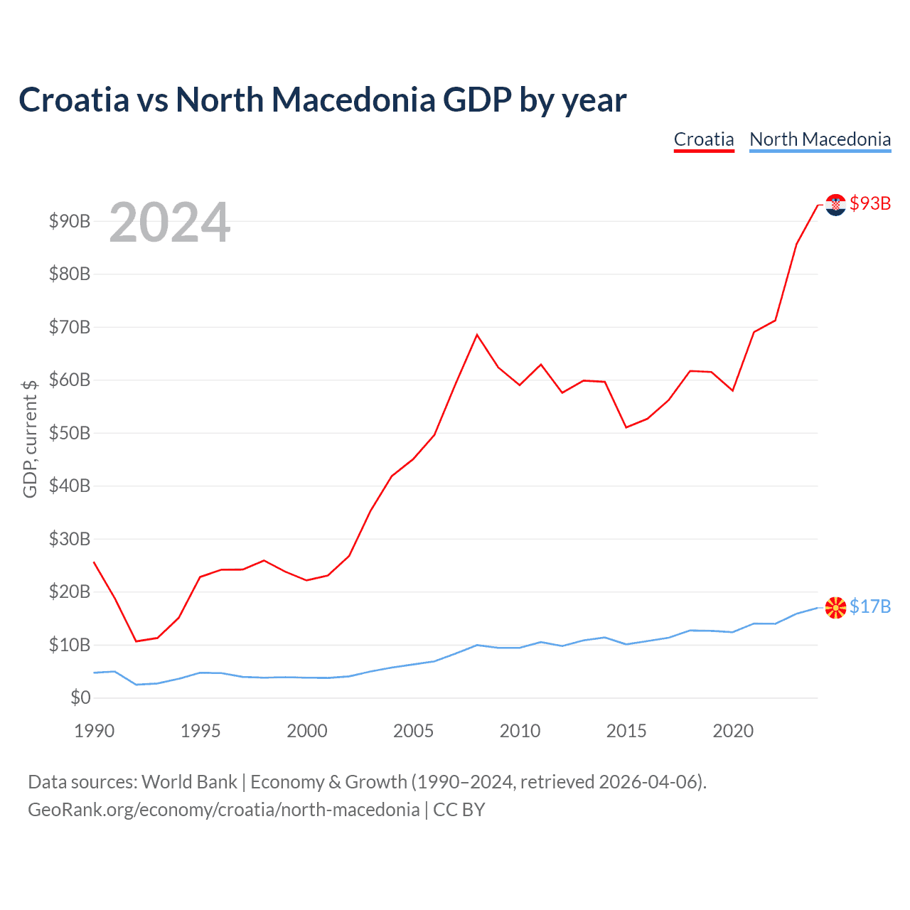 Croatia has a GDP of $93B compared to $17B for North Macedonia, ranking 75/197 and 138/197 by economy size, respectively.