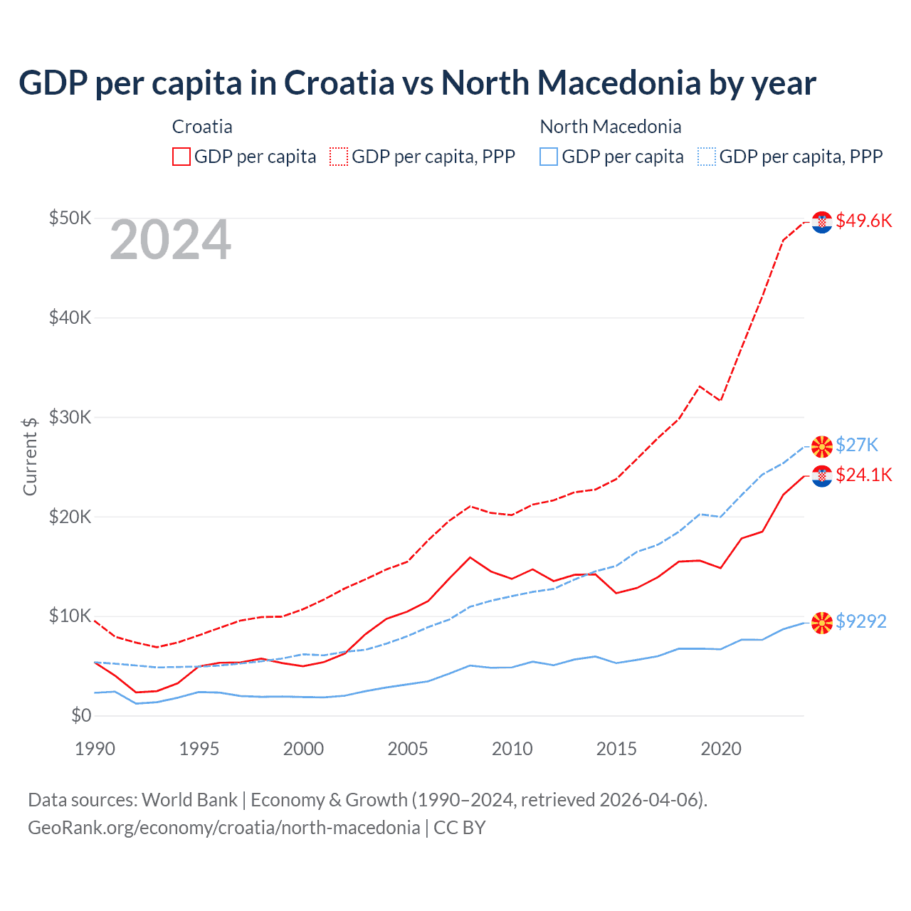 Croatia's GDP per capita is $24,050, ranking 50/197, compared to $9,292 in North Macedonia, ranking 88/197. Adjusted for purchasing power (GDP per capita PPP), Croatia ranks 46th at $49,551, while North Macedonia ranks 78th at $26,995.