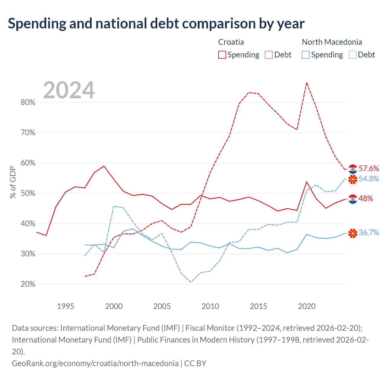 Croatia has $53.5B in government debt (57.6% of GDP), compared to $9.3B (54.8% of GDP) in North Macedonia.