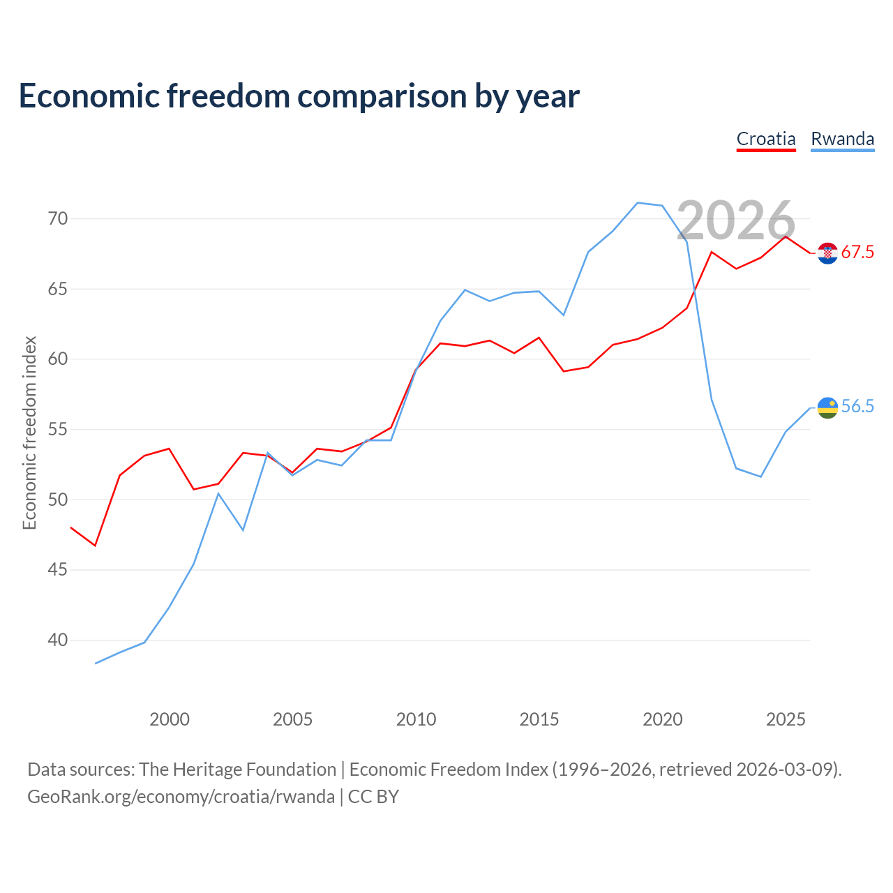 The Economic Freedom Index for Croatia is 67.5, ranking 56/197, compared to 56.5 for Rwanda, ranking 121/197. The chart above displays a comparison of annual changes in economic freedom indexes.