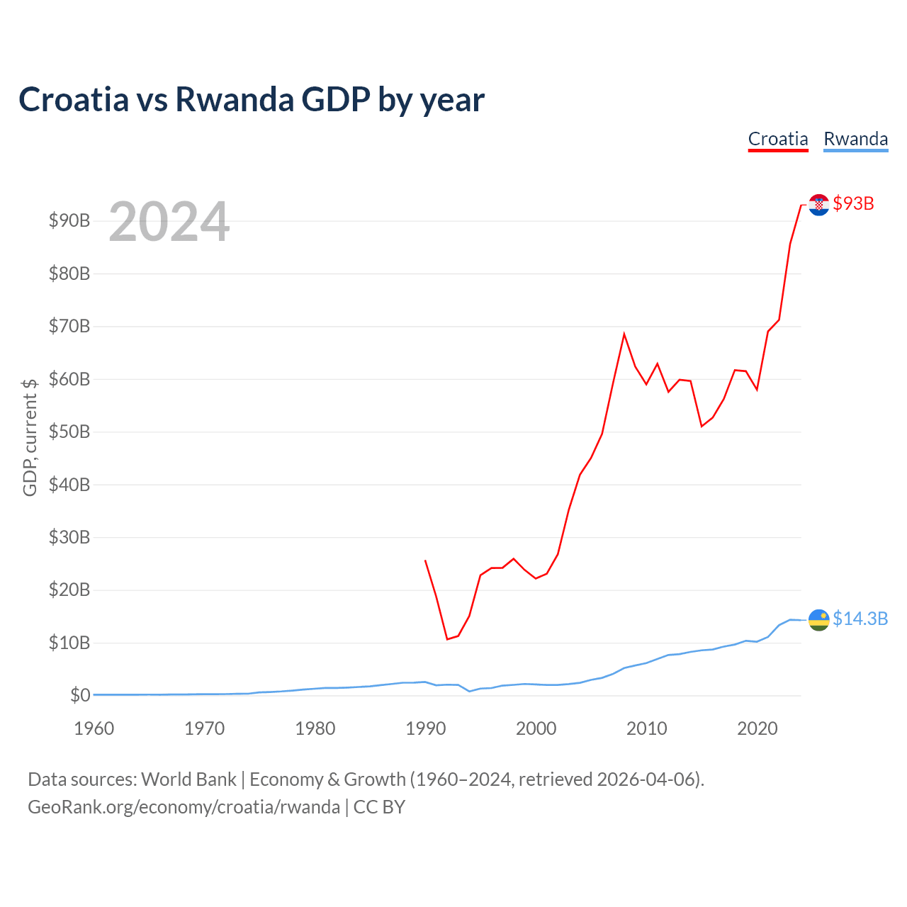 Croatia vs Rwanda GDP by year