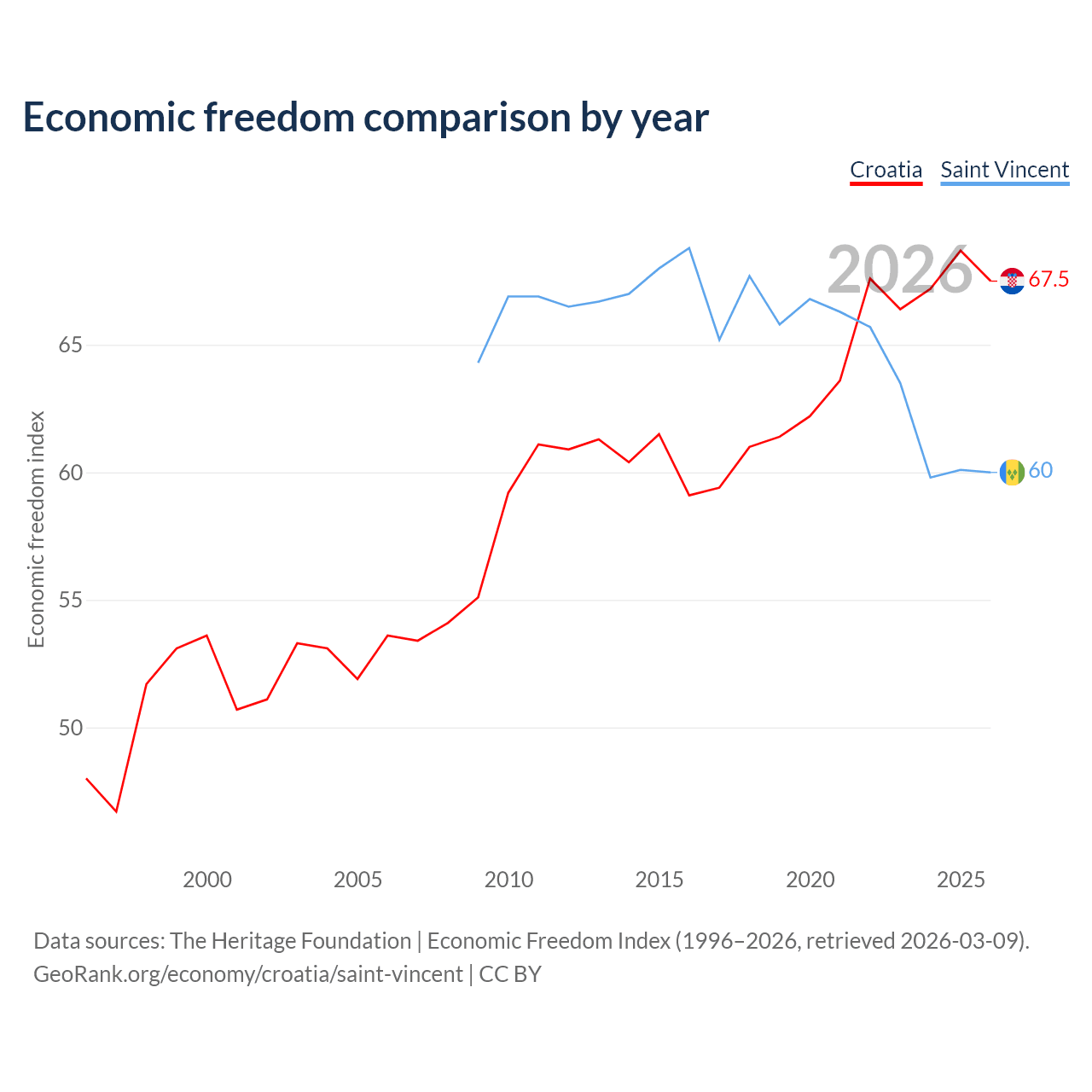 The Economic Freedom Index for Croatia is 67.5, ranking 56/197, compared to 60 for Saint Vincent, ranking 98/197. The chart above displays a comparison of annual changes in economic freedom indexes.