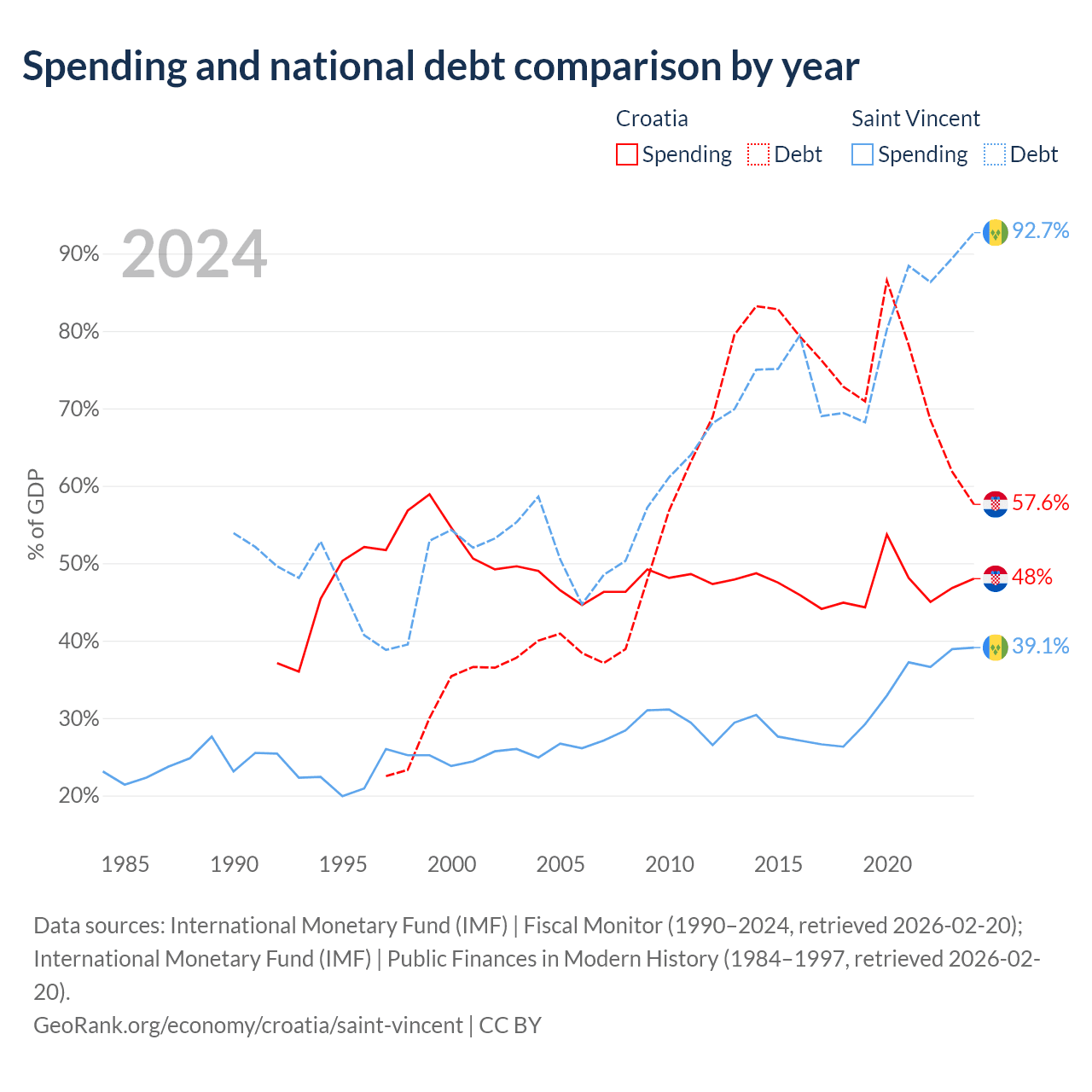 Croatia has $53.5B in government debt (57.6% of GDP), compared to $1.07B (92.7% of GDP) in Saint Vincent.