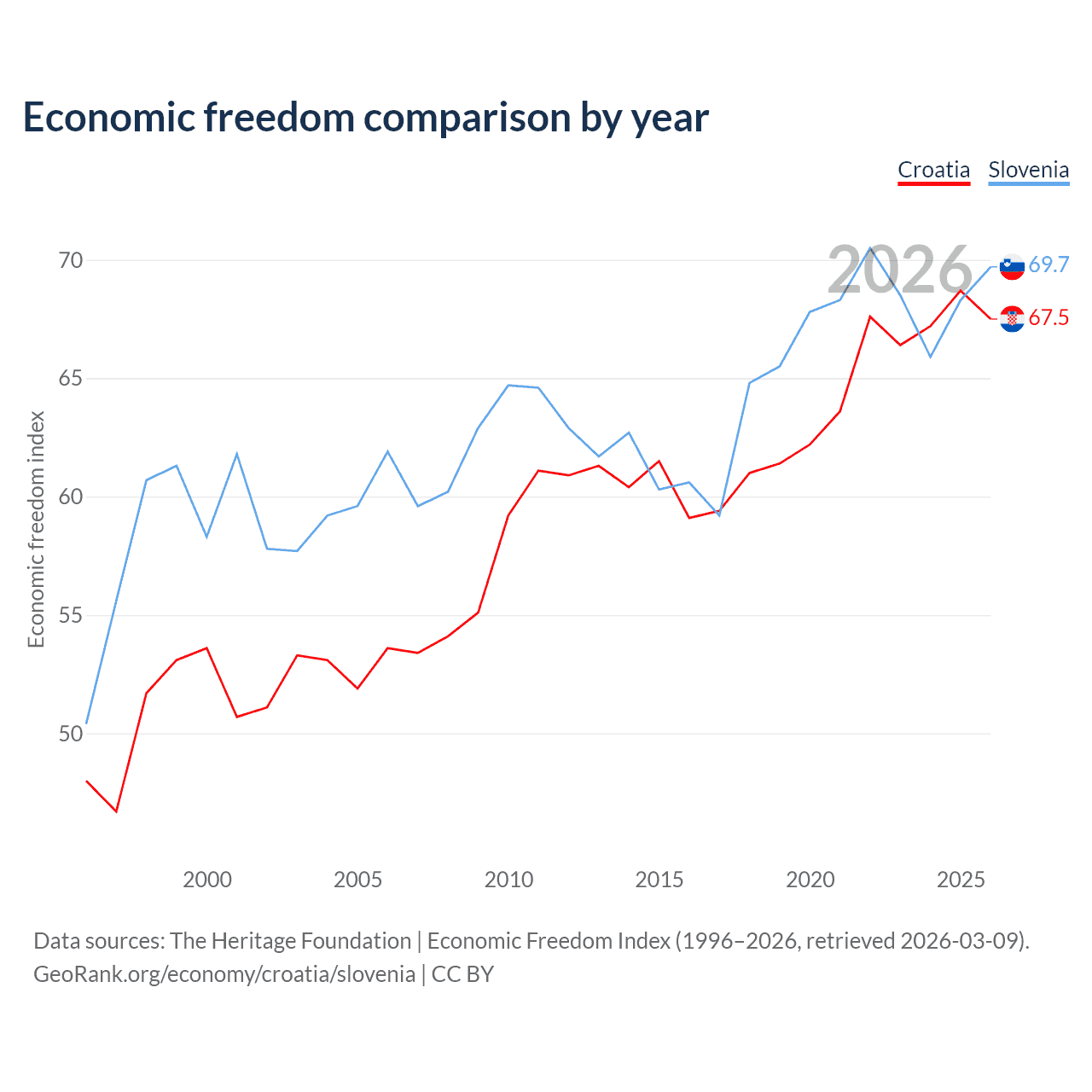 The Economic Freedom Index for Croatia is 67.5, ranking 56/197, compared to 69.7 for Slovenia, ranking 40/197. The chart above displays a comparison of annual changes in economic freedom indexes.