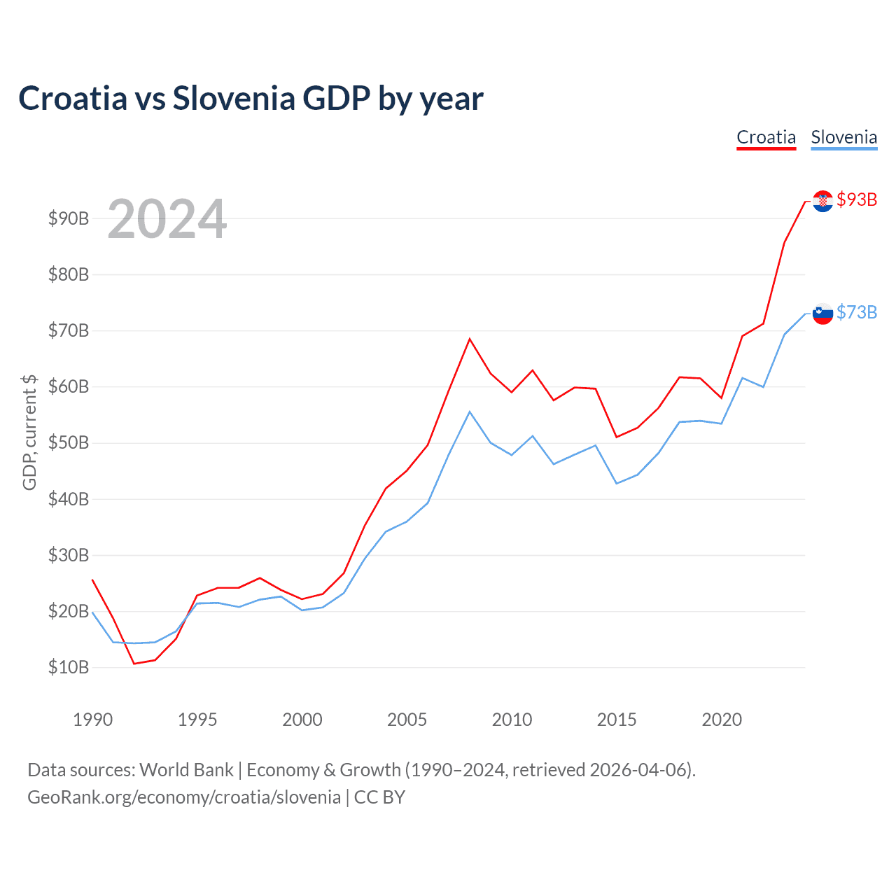 Croatia has a GDP of $93B compared to $73B for Slovenia, ranking 75/197 and 86/197 by economy size, respectively.