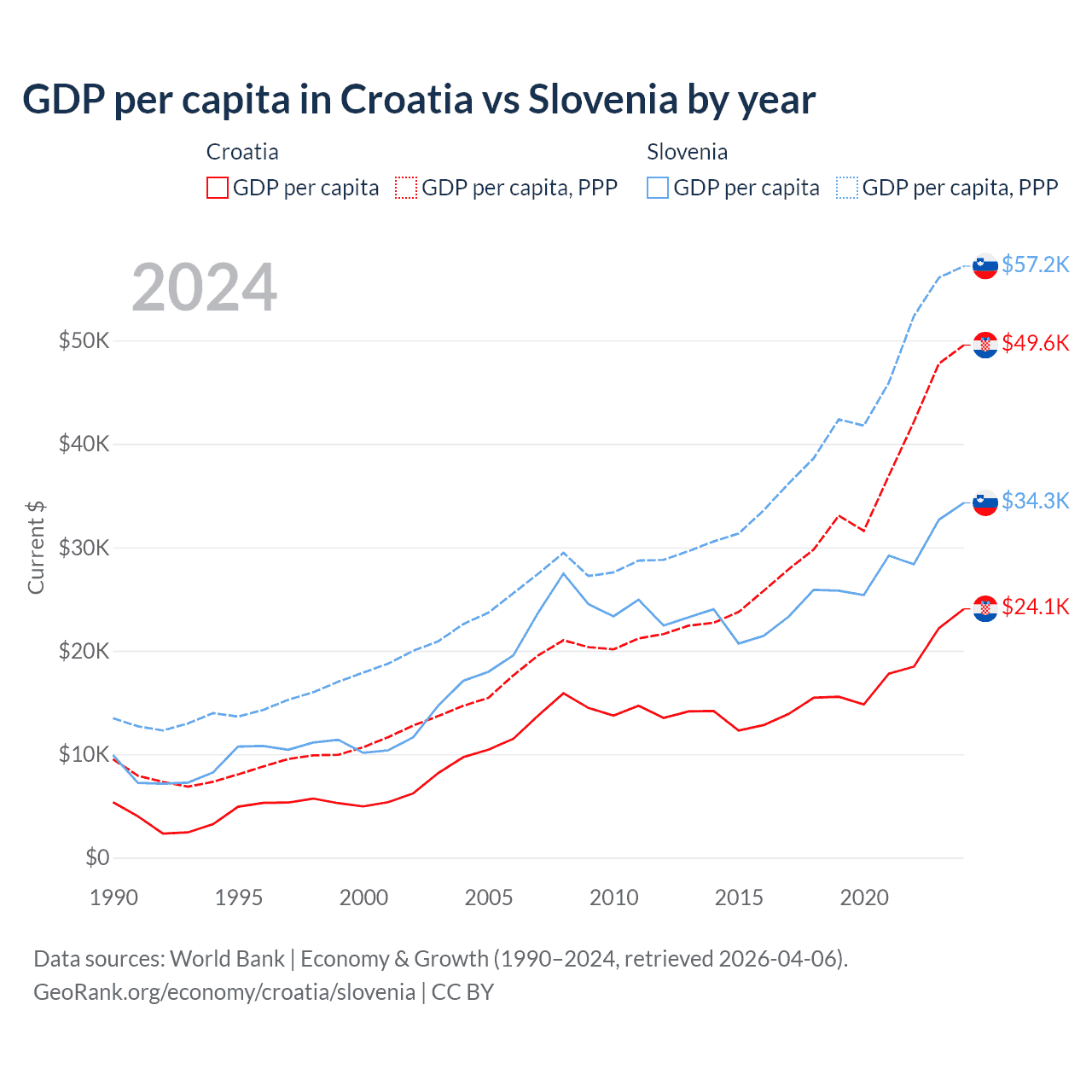 Croatia's GDP per capita is $24,050, ranking 50/197, compared to $34,301 in Slovenia, ranking 34/197. Adjusted for purchasing power (GDP per capita PPP), Croatia ranks 46th at $49,551, while Slovenia ranks 37th at $57,186.