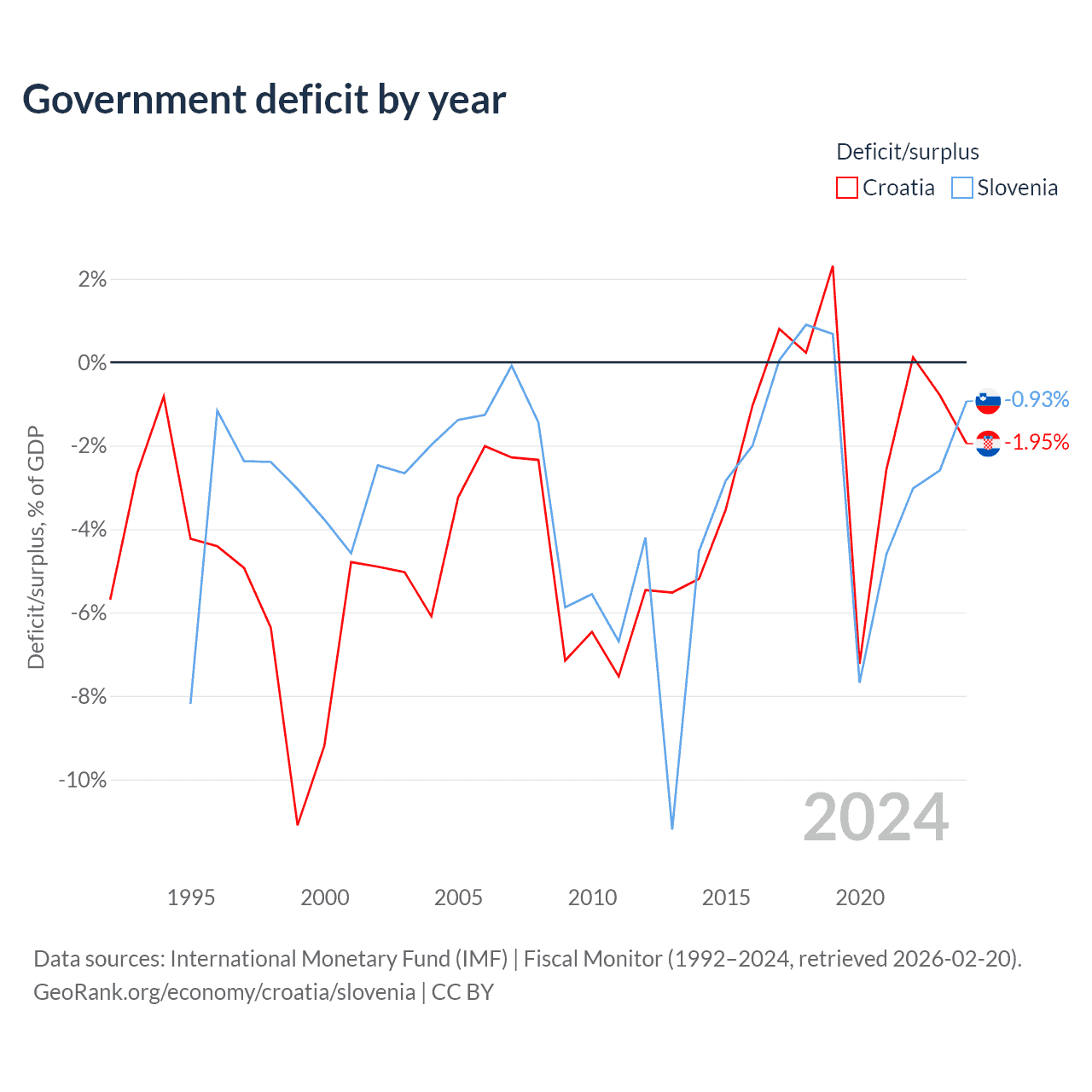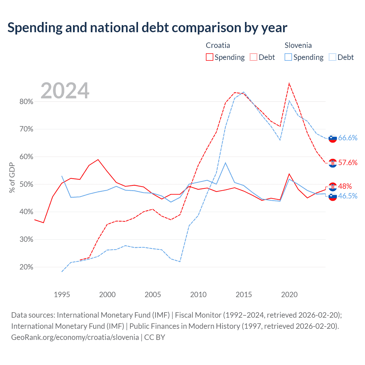 Croatia has $53.5B in government debt (57.6% of GDP), compared to $48.6B (66.6% of GDP) in Slovenia.