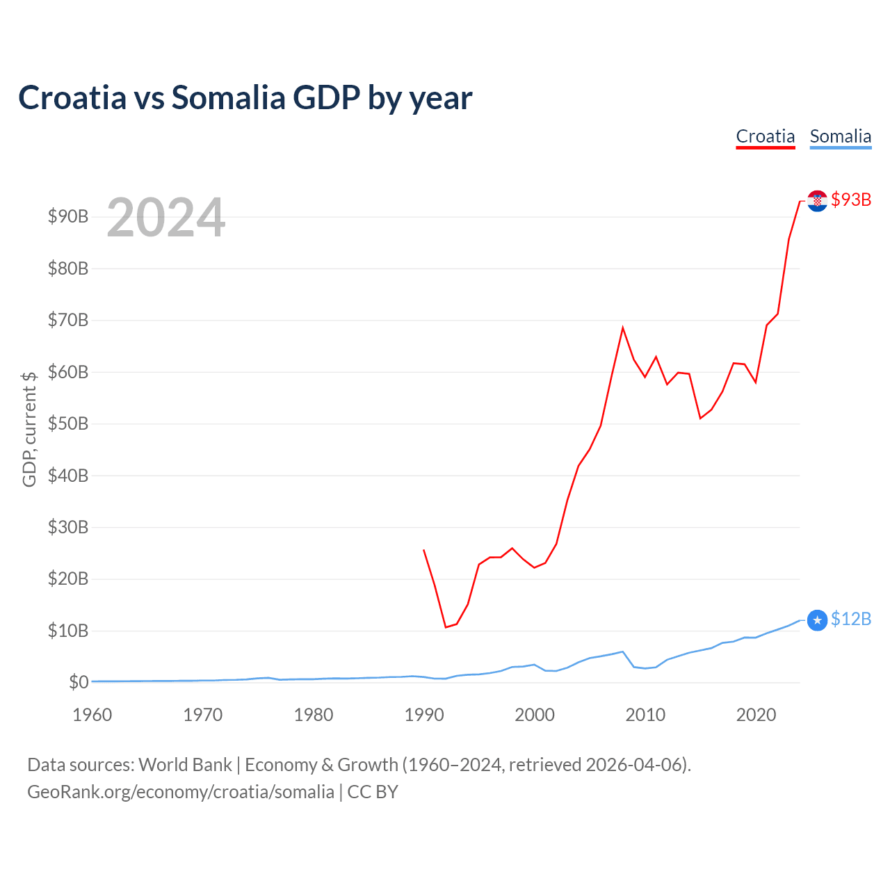 Croatia has a GDP of $93B compared to $12B for Somalia, ranking 75/197 and 150/197 by economy size, respectively.