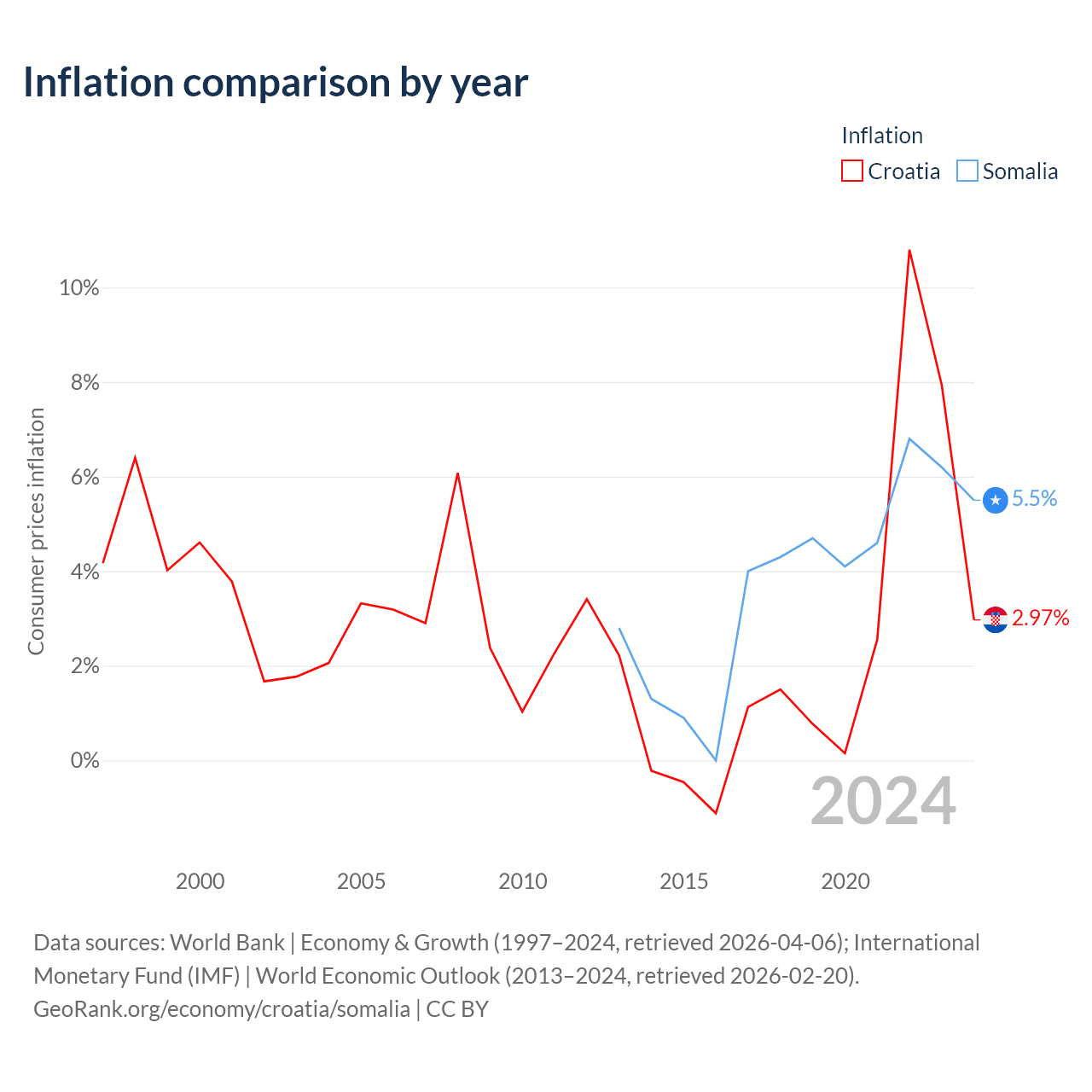 Over the past 12 years, Croatia has recorded an average annual inflation rate of 2.35%, compared with 3.77% in Somalia. In 2024, inflation was 2.97% in Croatia and 5.5% in Somalia.