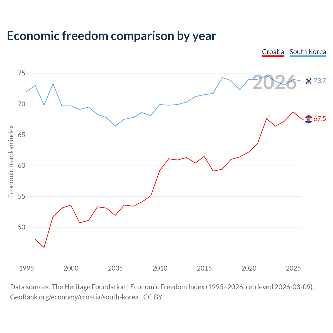 The Economic Freedom Index for Croatia is 67.5, ranking 56/197, compared to 73.7 for South Korea, ranking 24/197. The chart above displays a comparison of annual changes in economic freedom indexes.