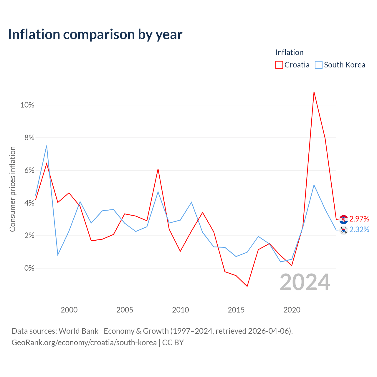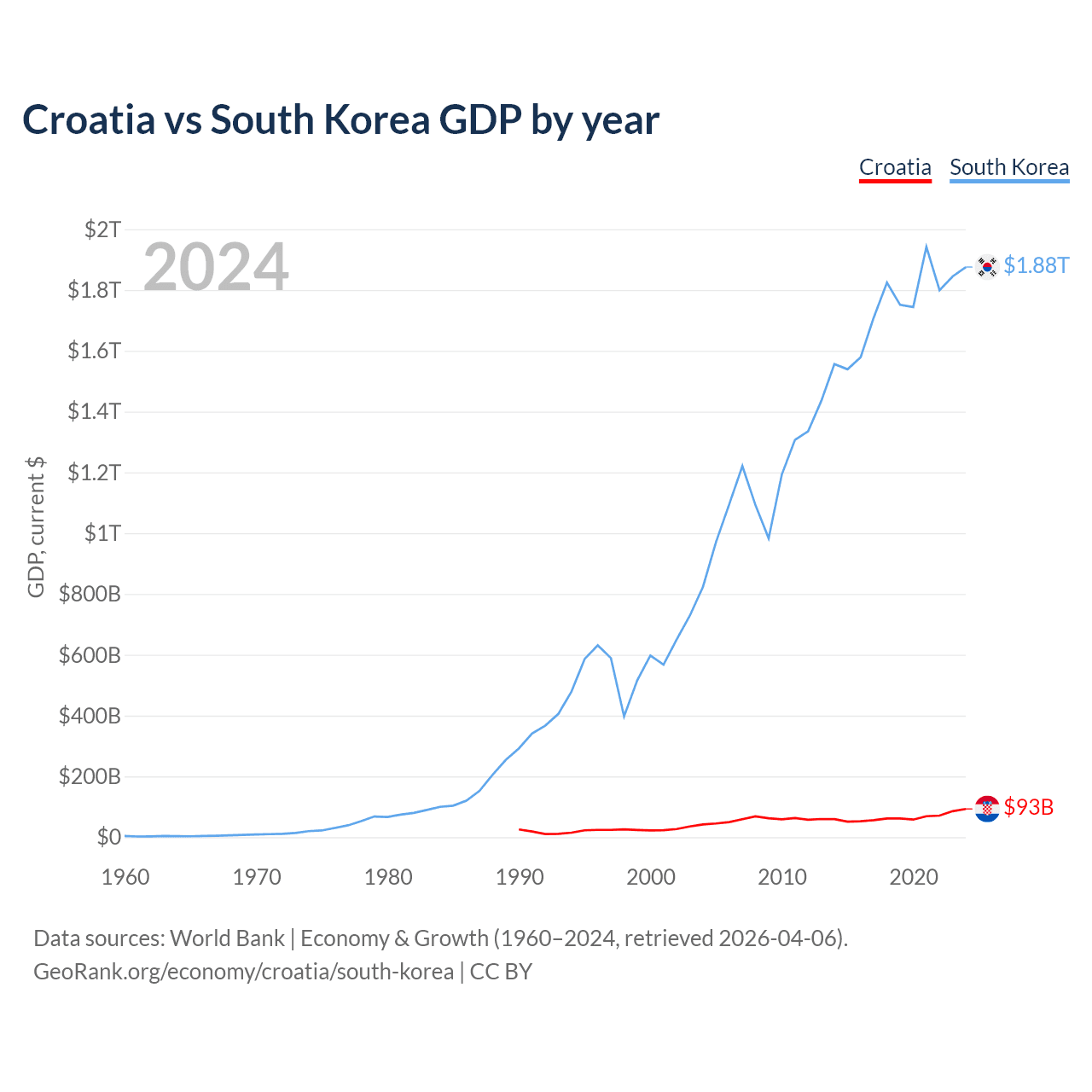 Croatia has a GDP of $93B compared to $1.88T for South Korea, ranking 75/197 and 12/197 by economy size, respectively.