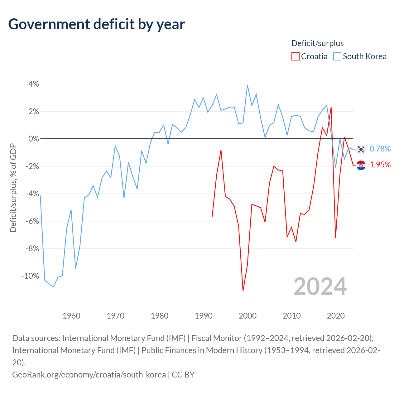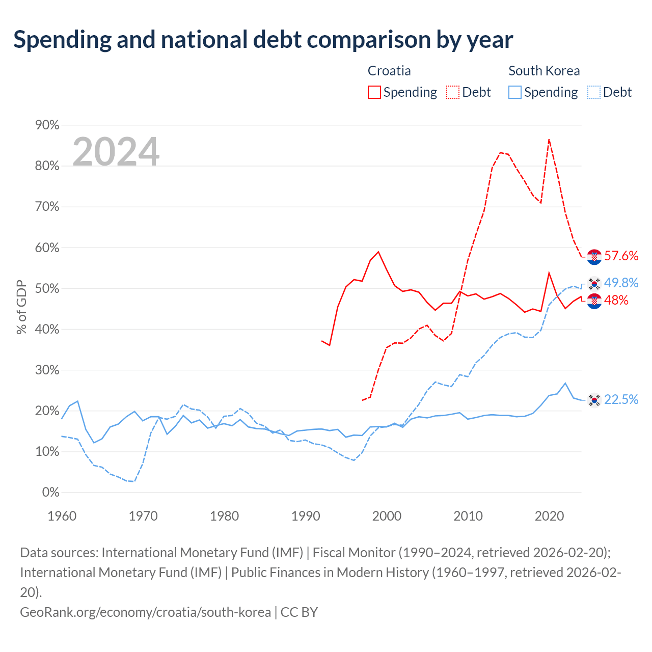 Croatia has $53.5B in government debt (57.6% of GDP), compared to $934B (49.8% of GDP) in South Korea.
