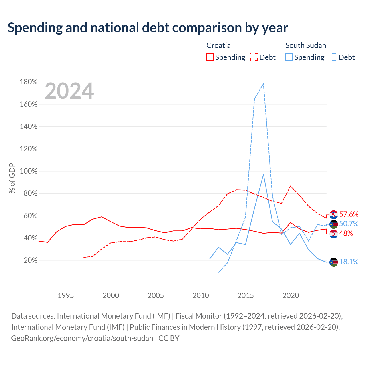 Croatia has $53.5B in government debt (57.6% of GDP), compared to $7.04B (50.7% of GDP) in South Sudan.