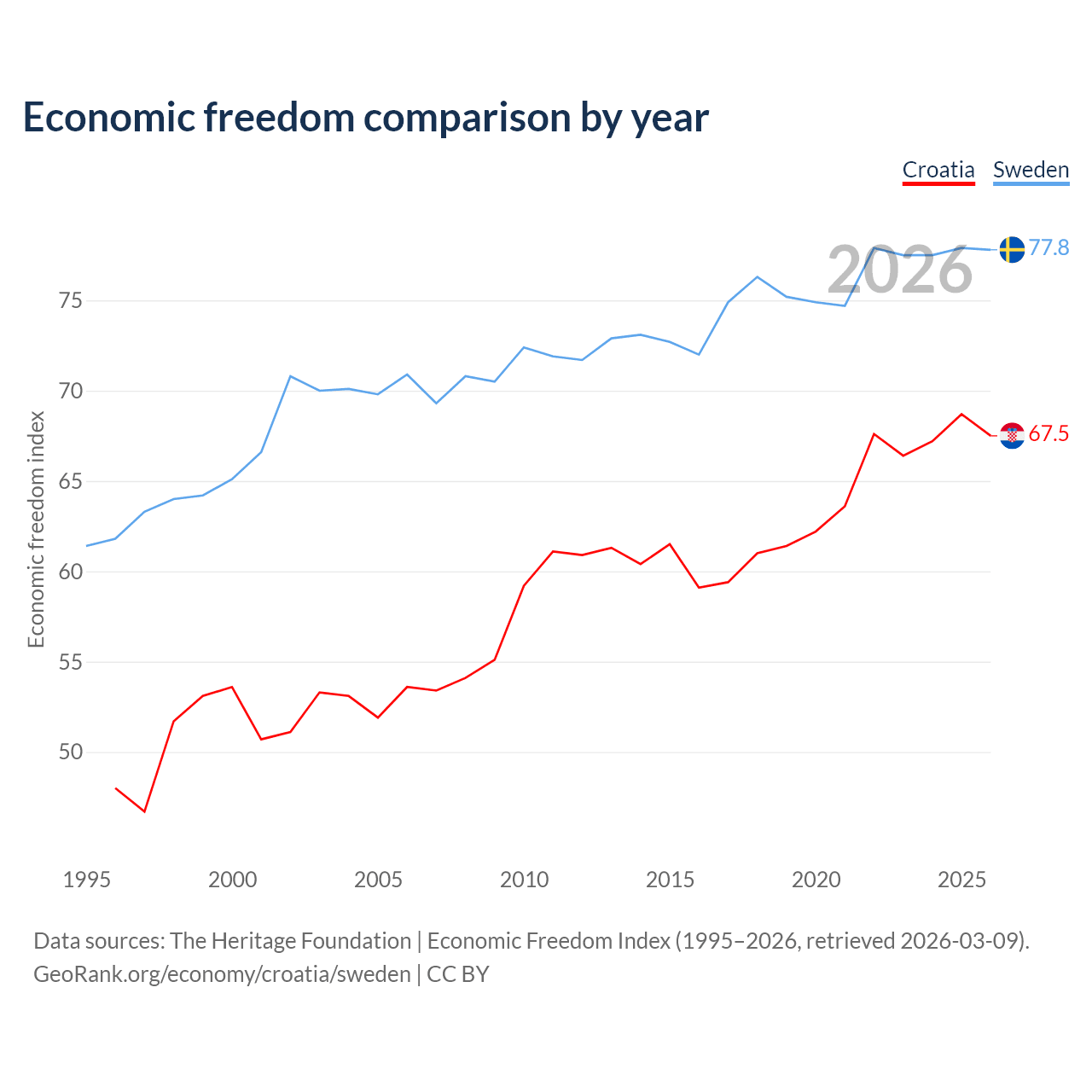 The Economic Freedom Index for Croatia is 67.5, ranking 56/197, compared to 77.8 for Sweden, ranking 14/197. The chart above displays a comparison of annual changes in economic freedom indexes.