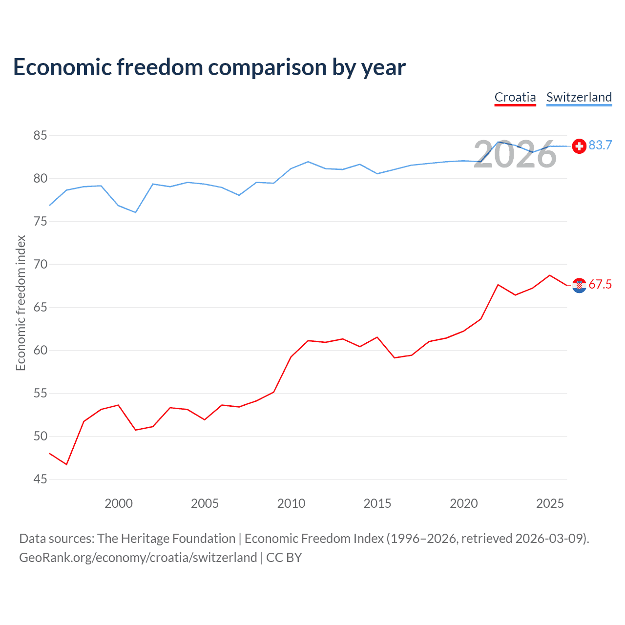 The Economic Freedom Index for Croatia is 67.5, ranking 56/197, compared to 83.7 for Switzerland, ranking 2/197. The chart above displays a comparison of annual changes in economic freedom indexes.