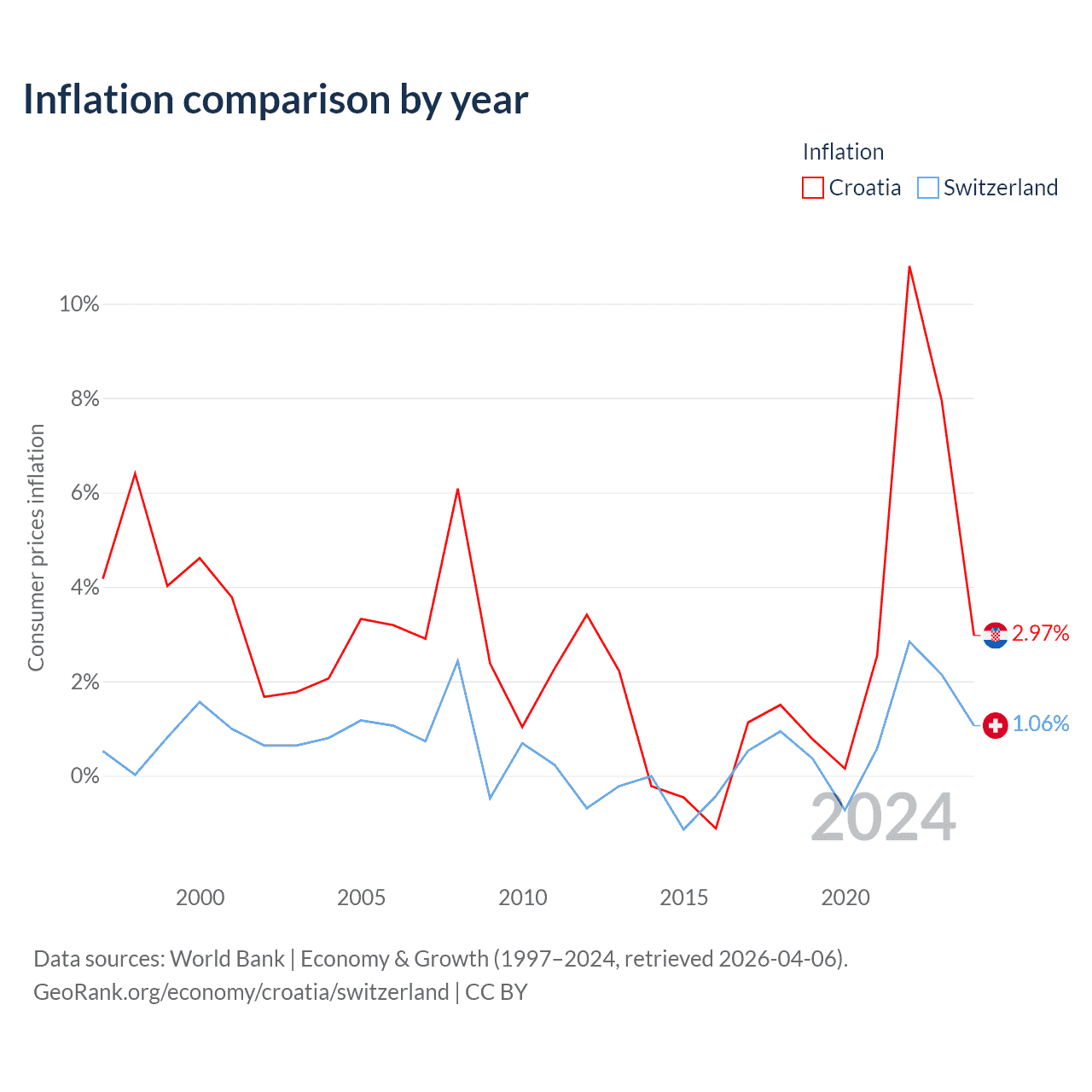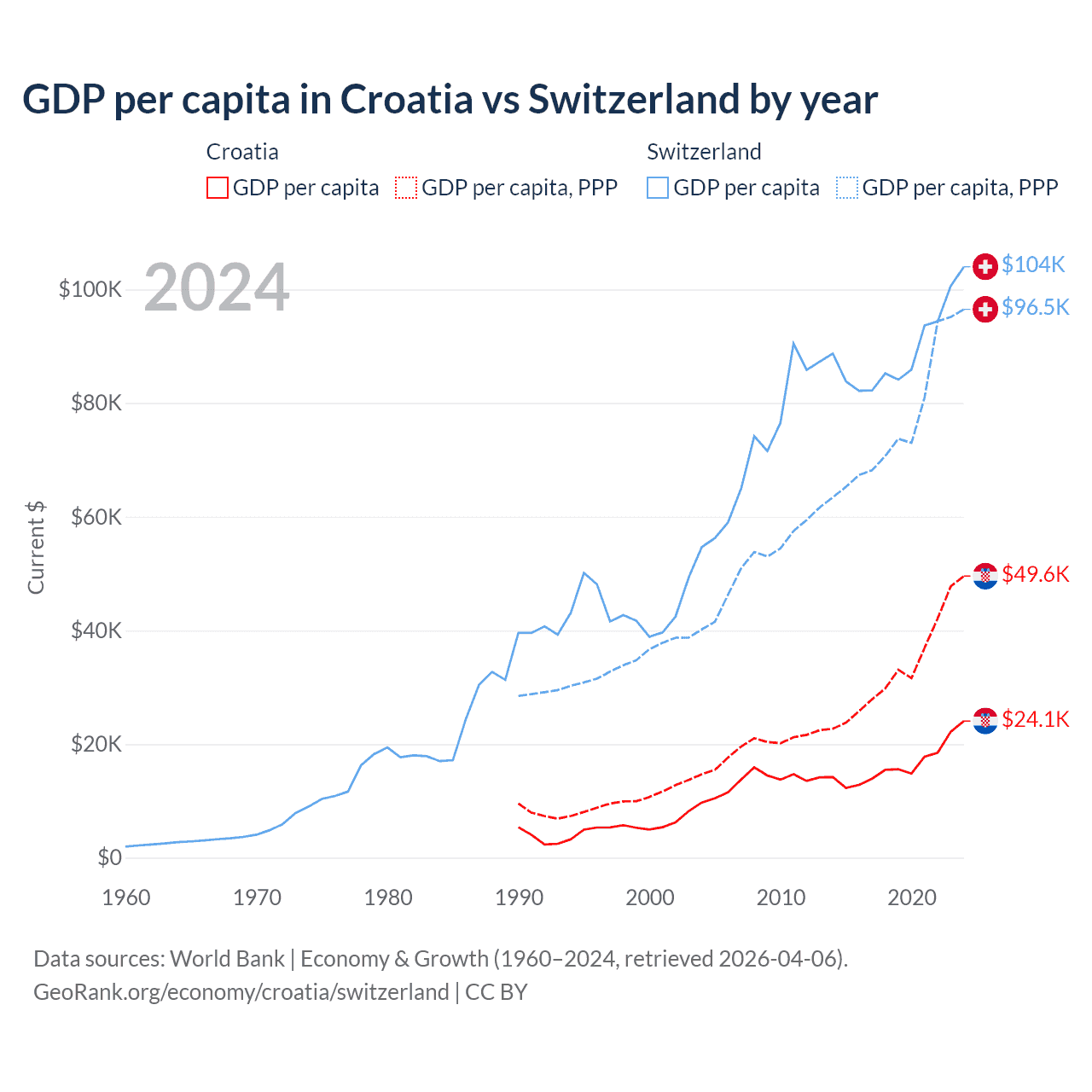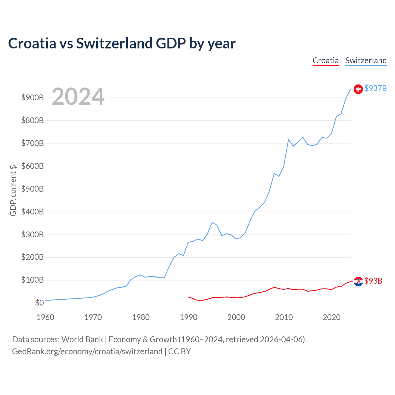 Croatia has a GDP of $93B compared to $937B for Switzerland, ranking 75/197 and 20/197 by economy size, respectively.