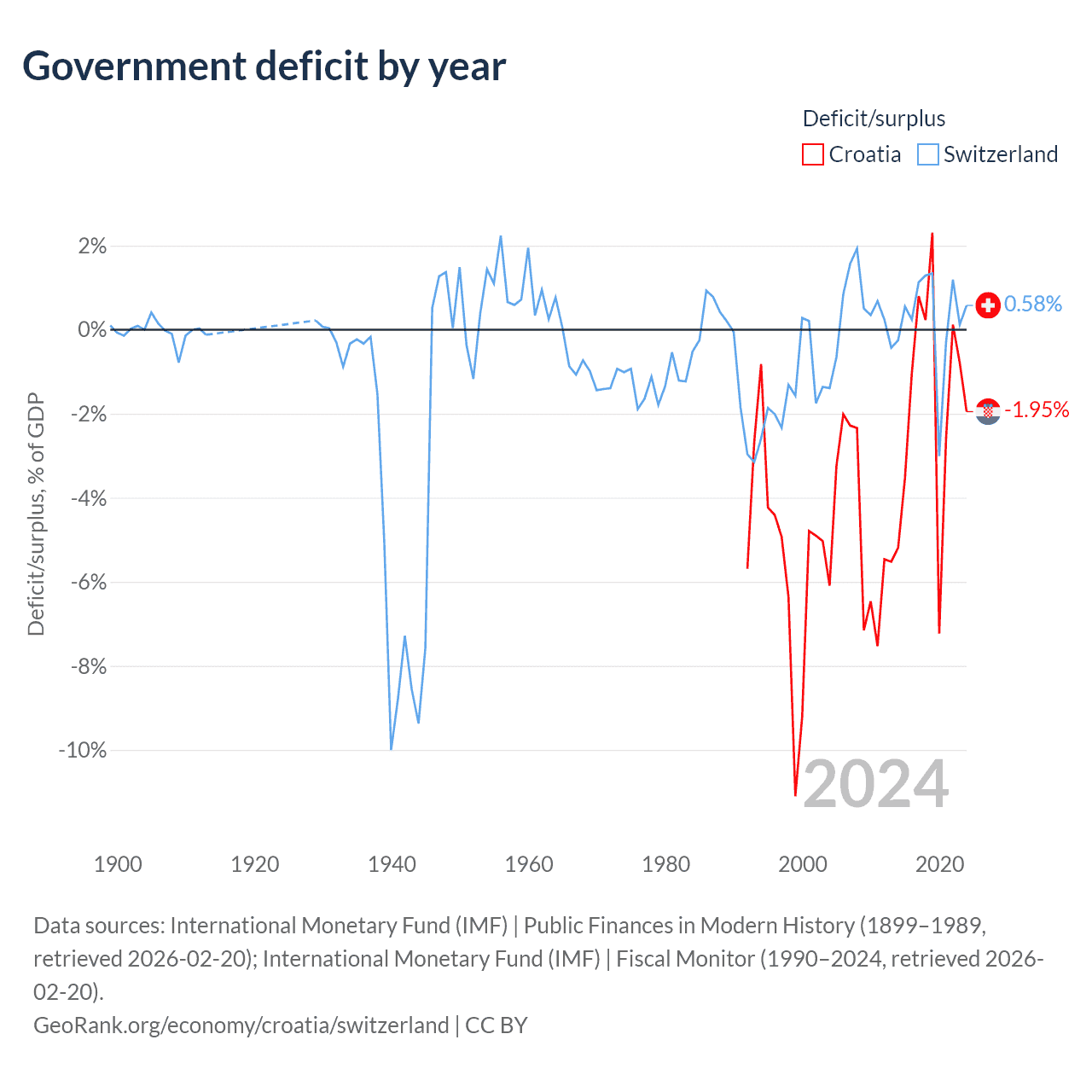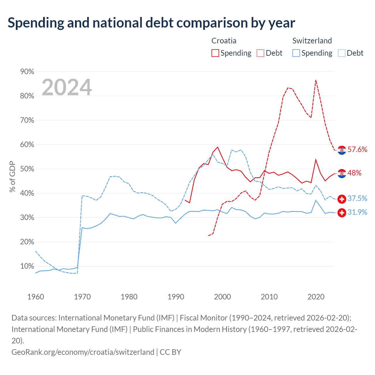 Croatia has $53.5B in government debt (57.6% of GDP), compared to $351B (37.5% of GDP) in Switzerland.
