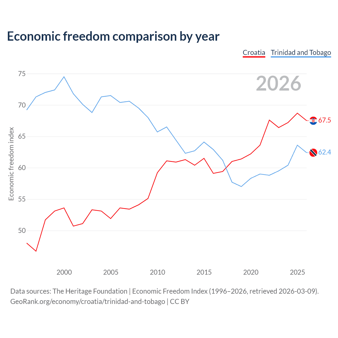 The Economic Freedom Index for Croatia is 67.5, ranking 56/197, compared to 62.4 for Trinidad and Tobago, ranking 87/197. The chart above displays a comparison of annual changes in economic freedom indexes.