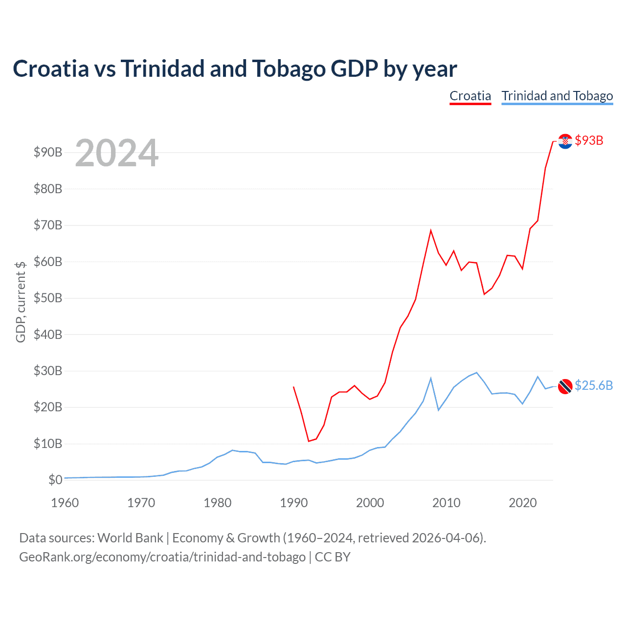 Croatia has a GDP of $93B compared to $25.6B for Trinidad and Tobago, ranking 75/197 and 115/197 by economy size, respectively.