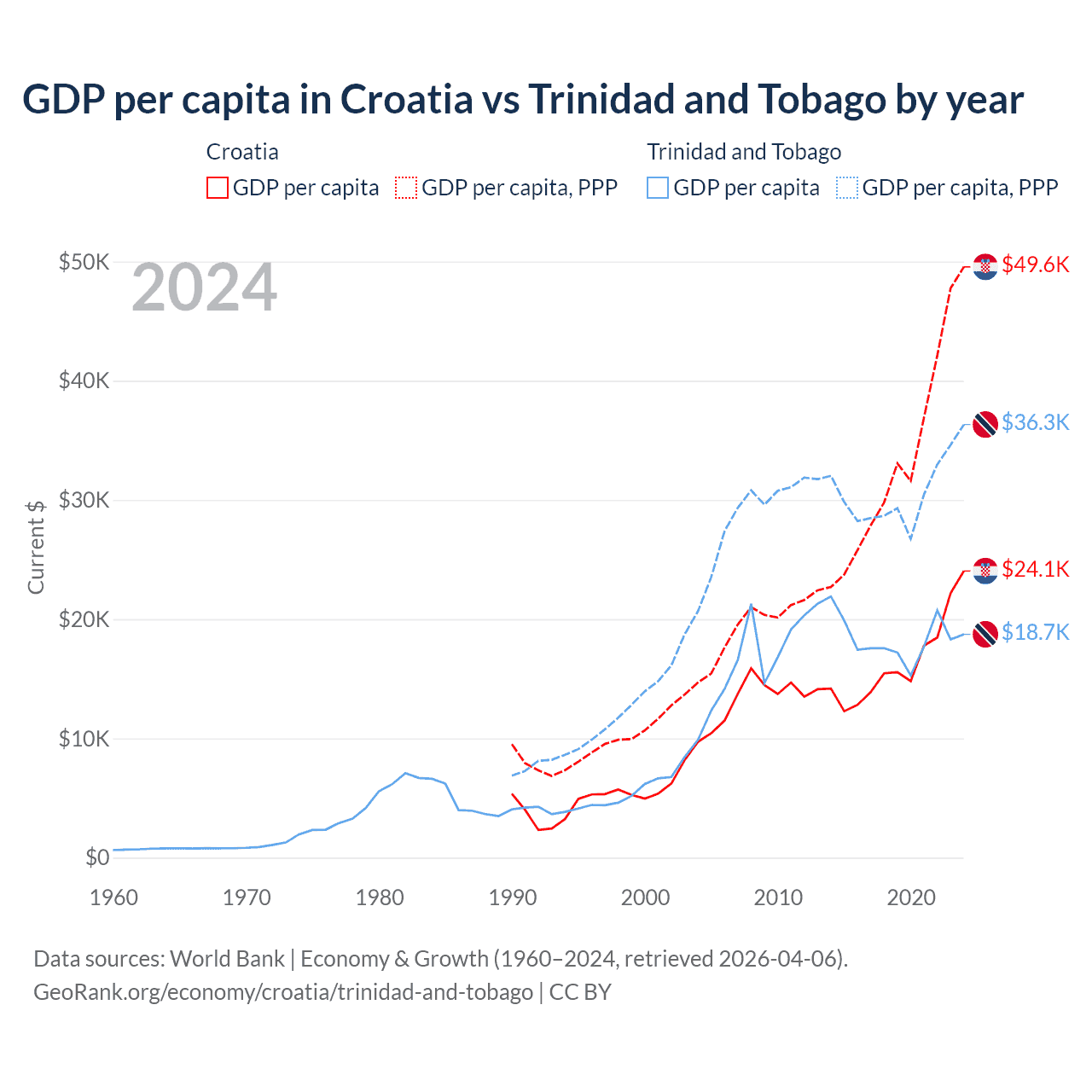 GDP per capita in Croatia vs Trinidad and Tobago by year