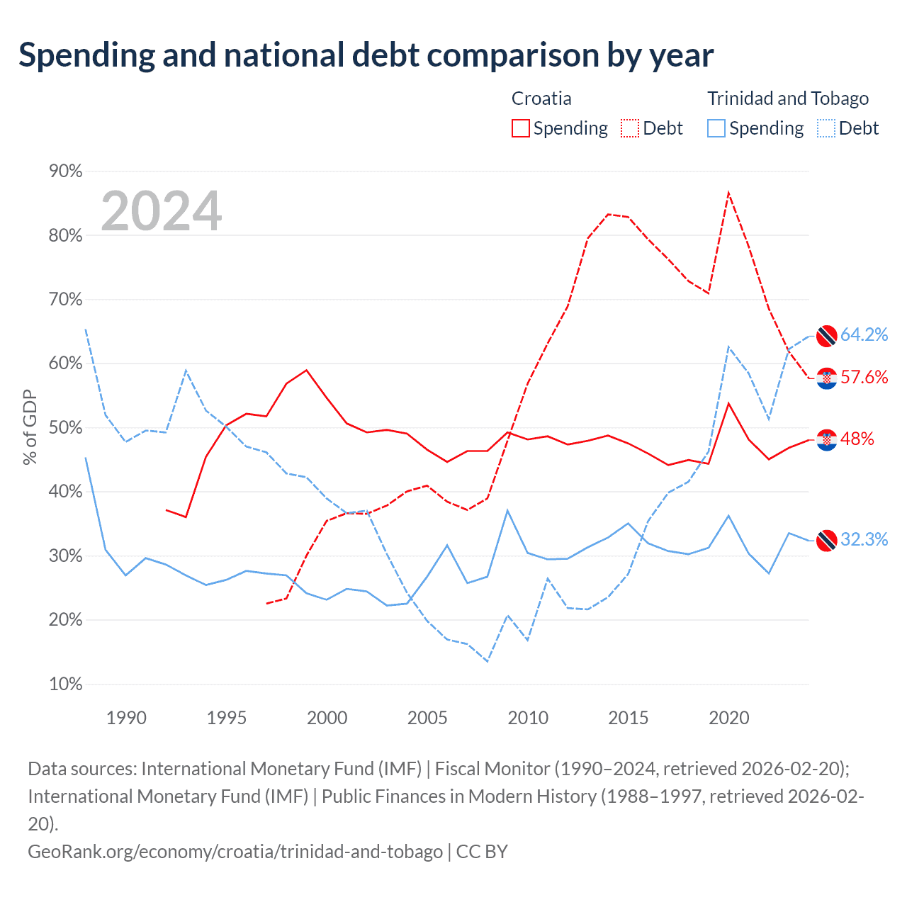 Croatia has $53.5B in government debt (57.6% of GDP), compared to $16.5B (64.2% of GDP) in Trinidad and Tobago.