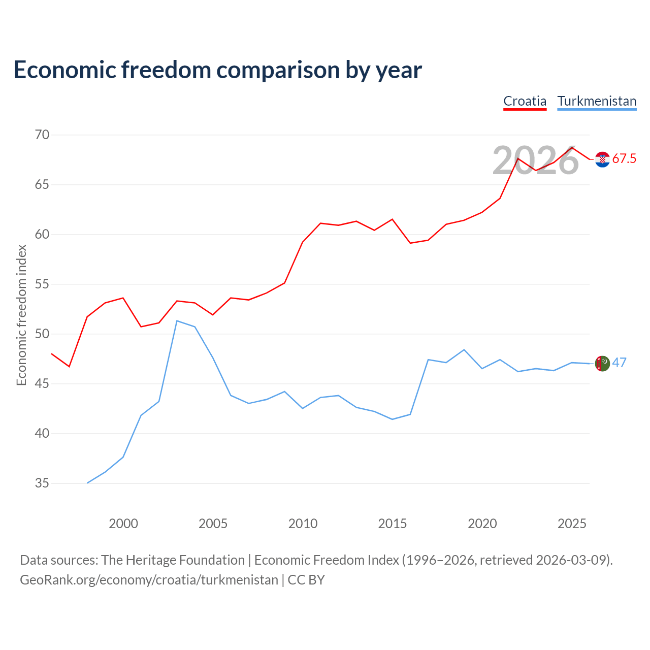 The Economic Freedom Index for Croatia is 67.5, ranking 56/197, compared to 47 for Turkmenistan, ranking 177/197. The chart above displays a comparison of annual changes in economic freedom indexes.