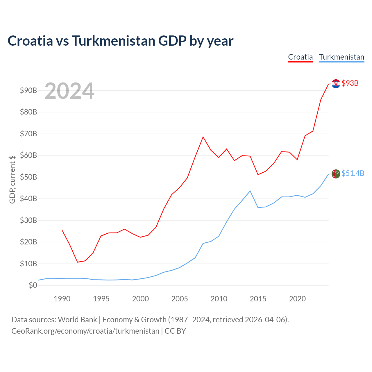 Croatia has a GDP of $93B compared to $51.4B for Turkmenistan, ranking 75/197 and 92/197 by economy size, respectively.
