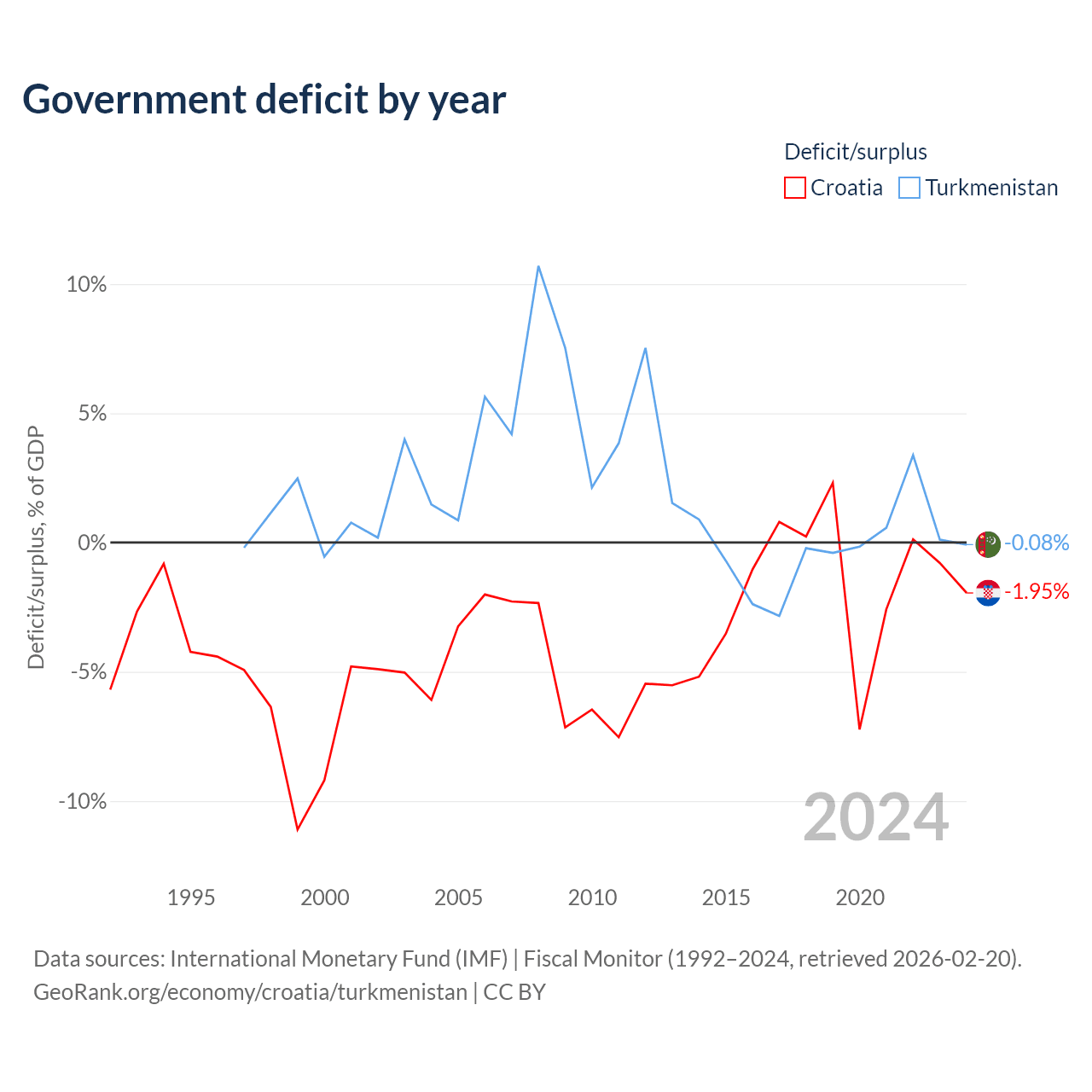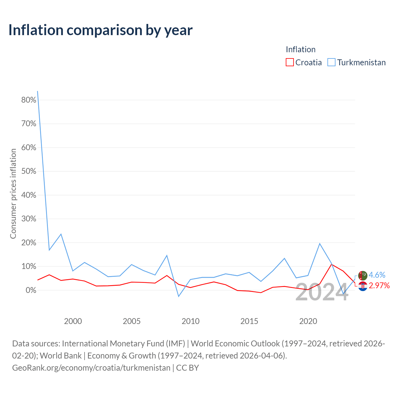 Croatia's GDP per capita is $24,050, ranking 50/197, compared to $6,857 in Turkmenistan, ranking 104/197. Adjusted for purchasing power (GDP per capita PPP), Croatia ranks 46th at $49,551, while Turkmenistan ranks 94th at $21,213.