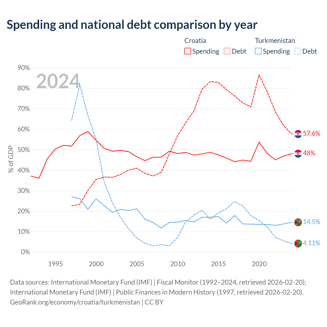 Croatia has $53.5B in government debt (57.6% of GDP), compared to $2.11B (4.11% of GDP) in Turkmenistan.
