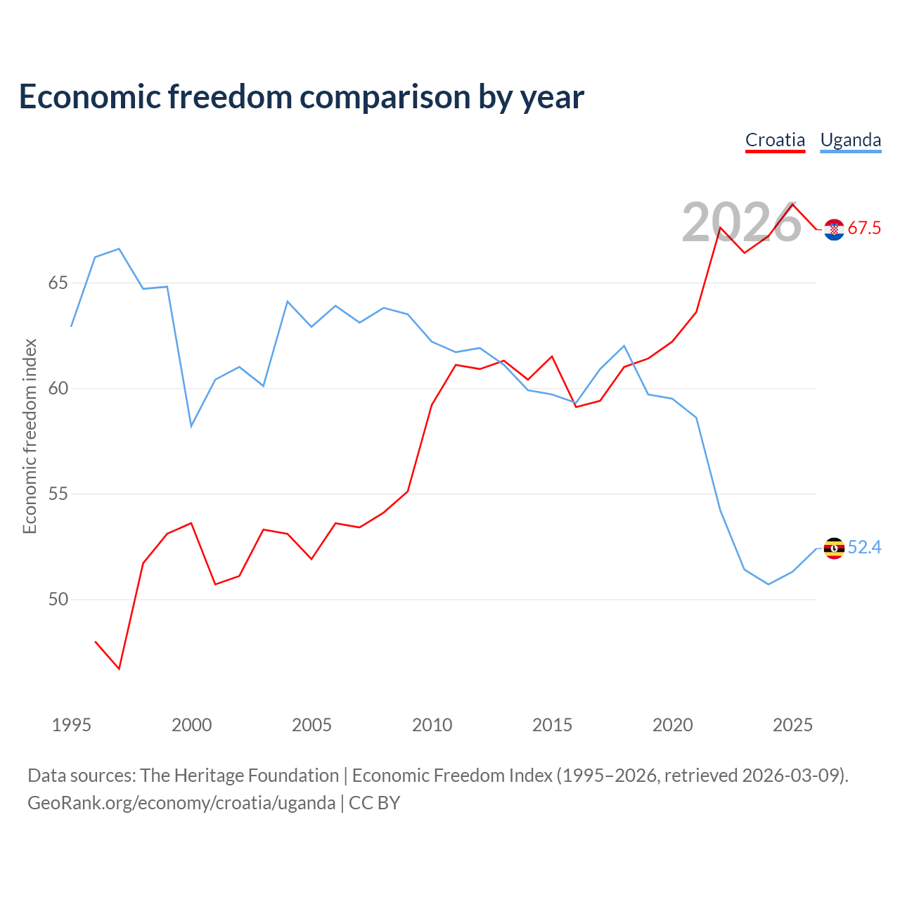The Economic Freedom Index for Croatia is 67.5, ranking 56/197, compared to 52.4 for Uganda, ranking 149/197. The chart above displays a comparison of annual changes in economic freedom indexes.