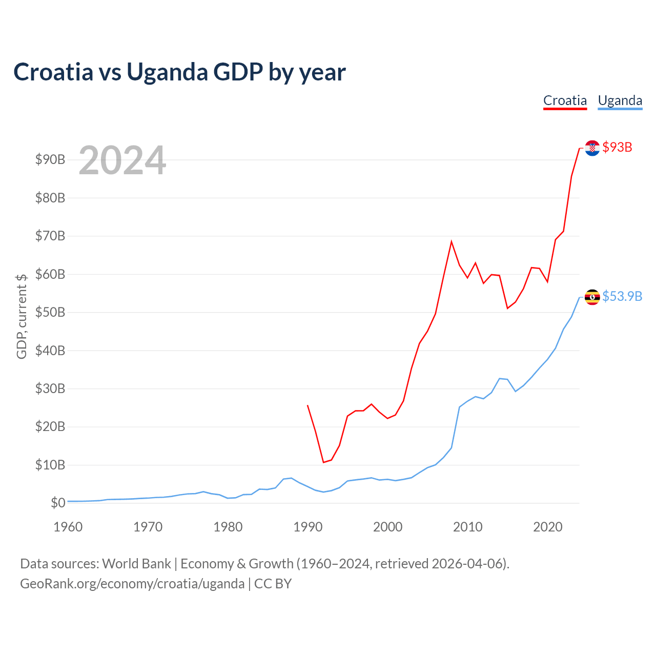 Croatia vs Uganda GDP by year